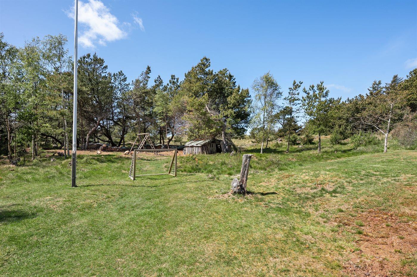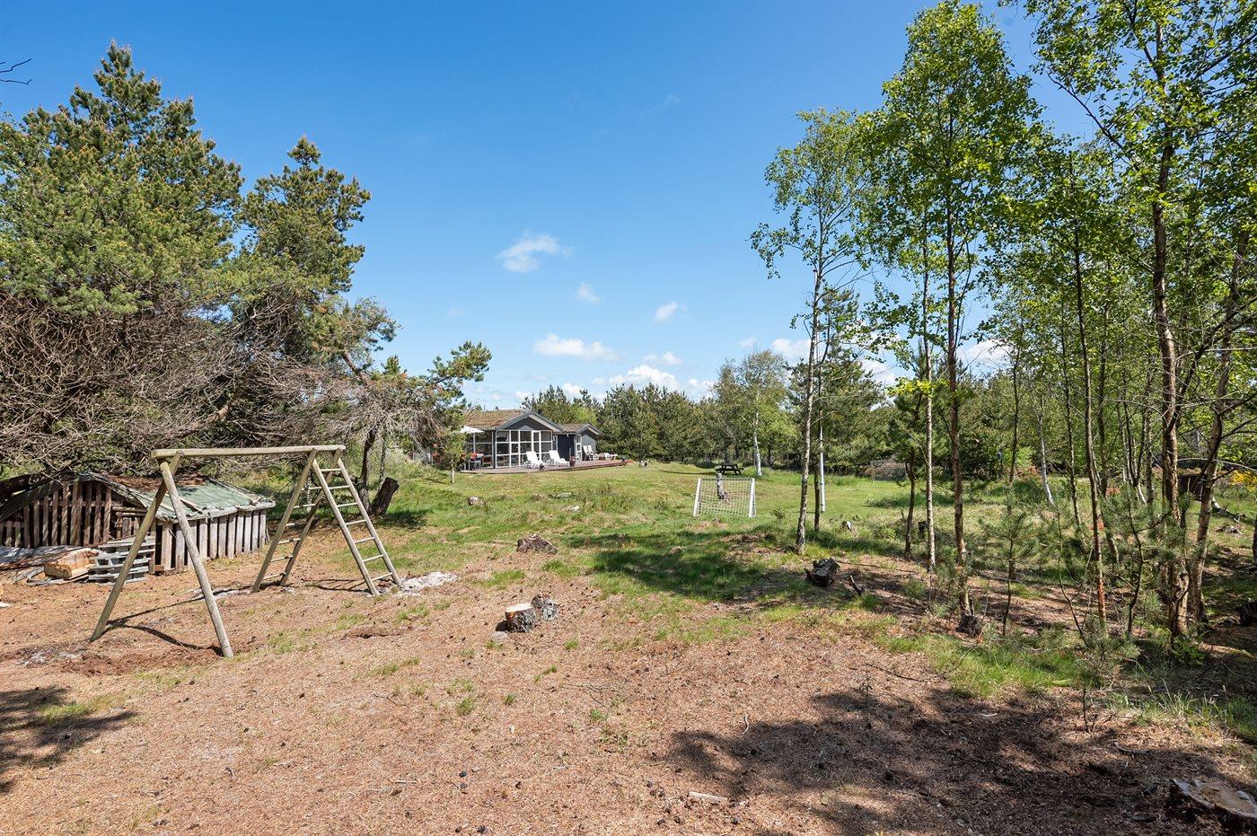 Ferieboligen er beliggende på en 3700 m² stor naturgrund. Der er 1000 m til havet. Nærmeste forretning er beliggende i en afstand af 2500 m. Til ferieboligen hører 45 m² terrasseareal. Desuden er der 17 m² overdækket terrasse, hvor der er installeret terrassevarmer over spisebordet. Der er redskabsrum. Gynge. Der er installeret stik til opladning af elbil. Med 22 kW ladeeffekt. Parkering ved ferieboligen.