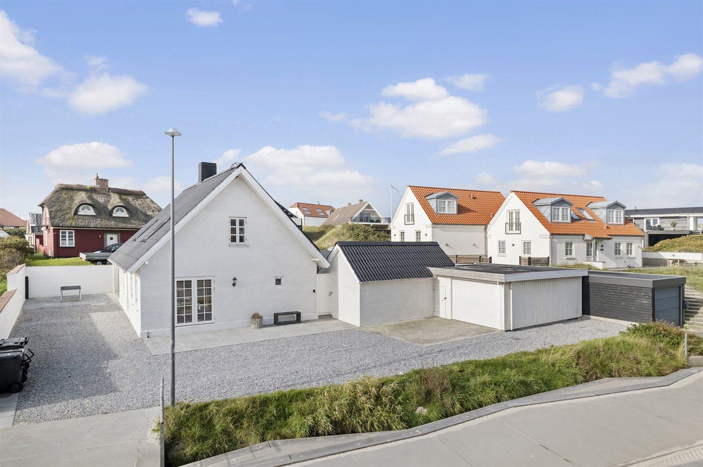 Ved nedkørslen til den brede sandstrand ved Blokhus ligger dette store sommerhus centralt i forhold til byens liv og stranden. Et godt sted for den store familie med dejlig udsigt til stranden og vandet fra husets 1. sal.