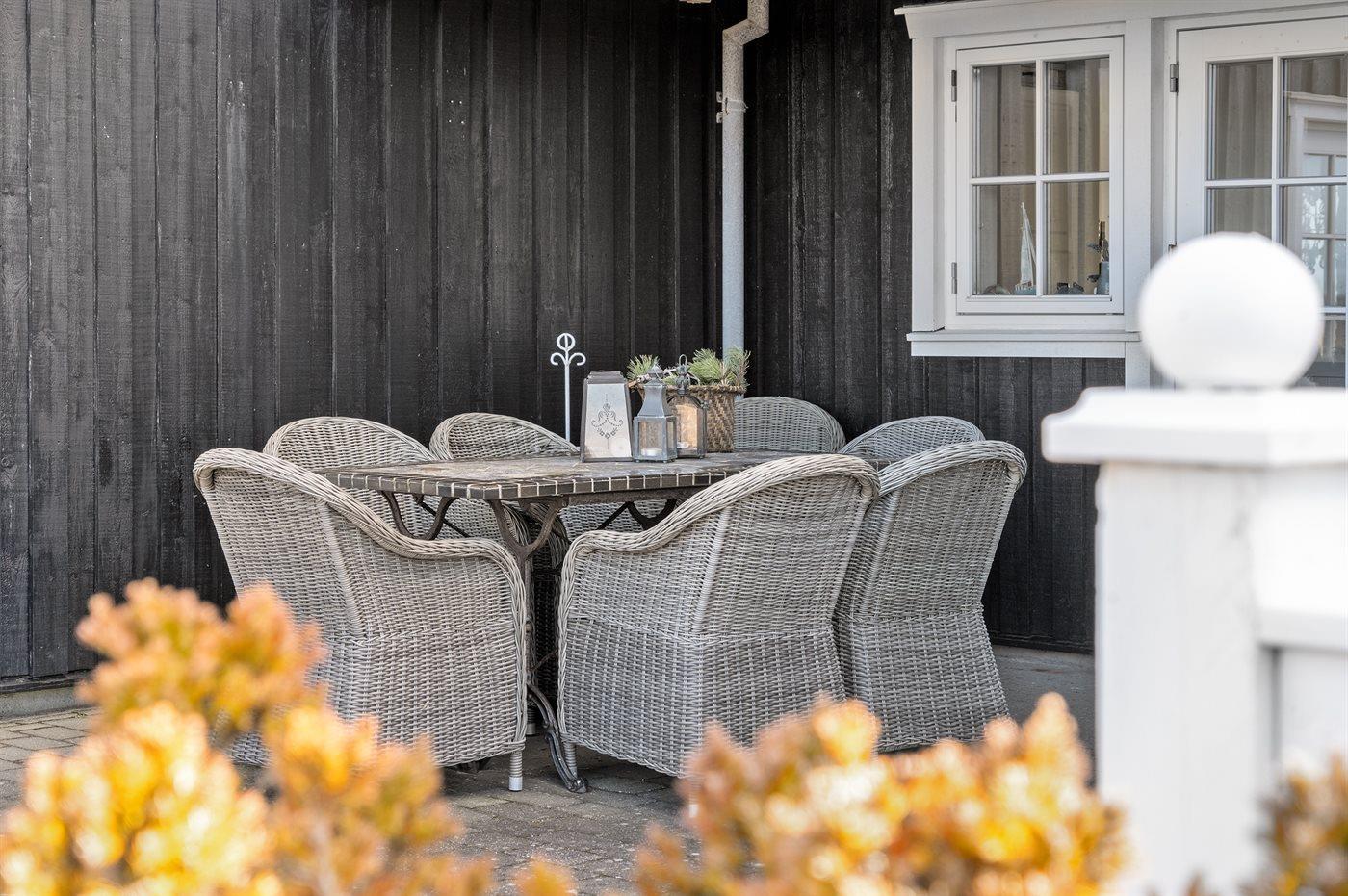 Huset er opført som en del af en klynge huse med fælles legeplads og multibane med mulighed for at spille tennis, håndbold og fodbold.