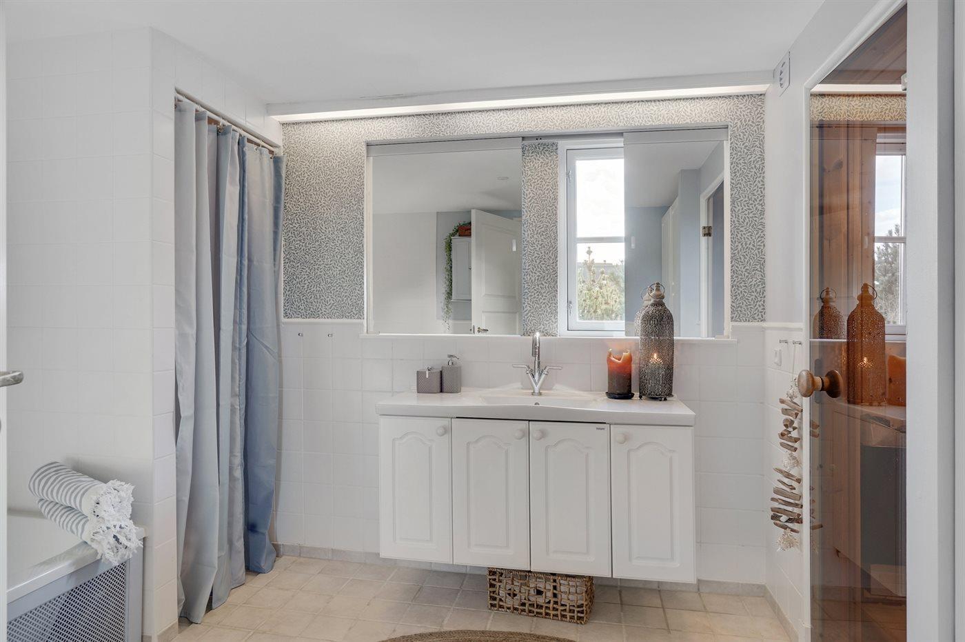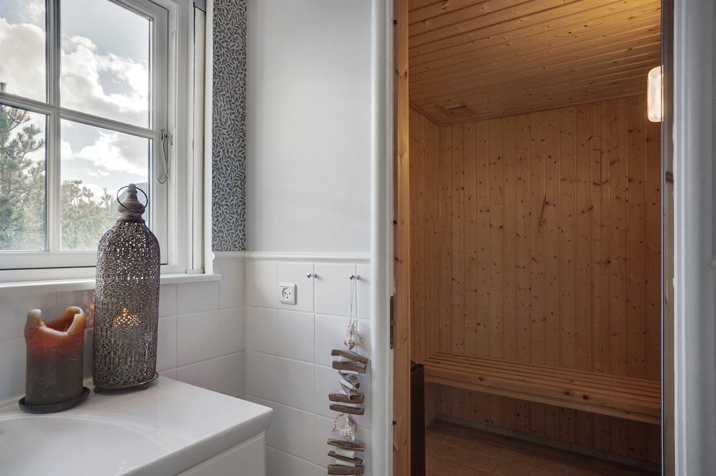 Der er 2 badeværelser med bruseniche og 2 toiletter. Der er gulvvarme på 2 badeværelser. I saunaen er der mulighed for afslapning.