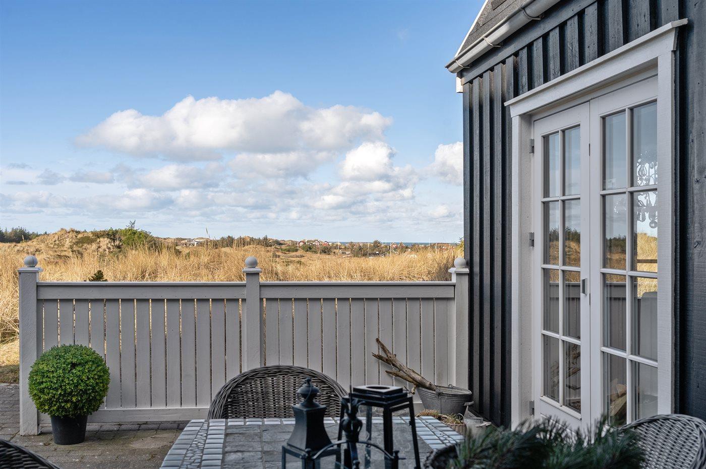 Syd for Blokhus centrum, i et kuperet naturområde op mod skoven og nær den brede, hvide sandstrand, ligger dette flotte sommerhus i 2 etager. Huset har tagterrasse, hvorfra der er udsigt til Vesterhavet og det fredede klitlandskab med Blokhus i baggrunden.