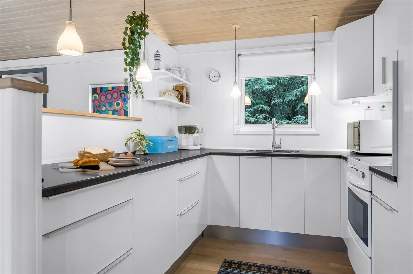 Køkkenet er udstyret med 1 køleskab. Der er 4 keramiske kogeplader, varmluftovn, mikrobølgeovn samt opvaskemaskine.