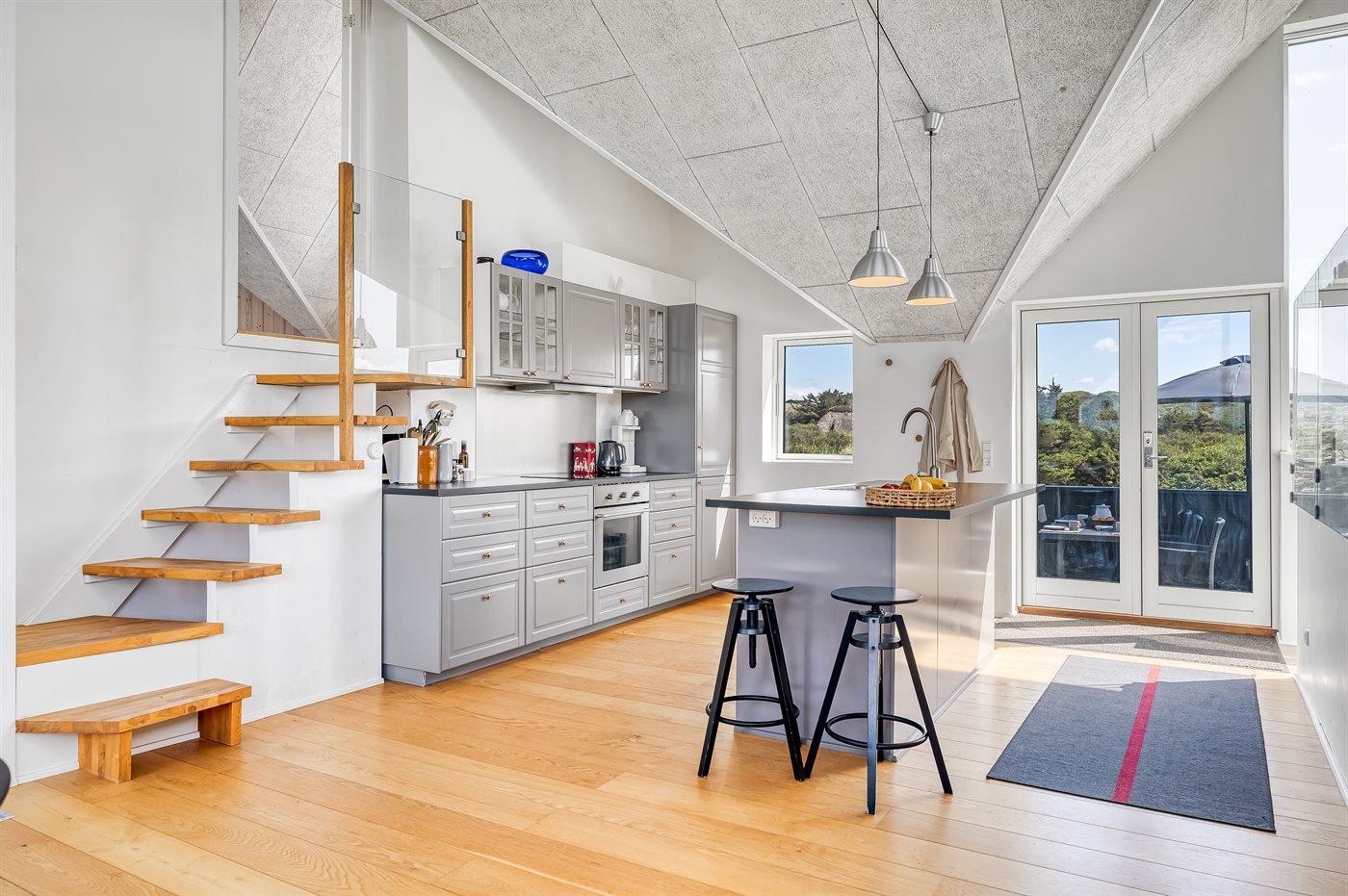 Fra det veludstyrede køkken er der direkte adgang til de skønne terrasser, der omkranser huset – perfekte til både solrige eftermiddage og hyggelige sommeraftener.