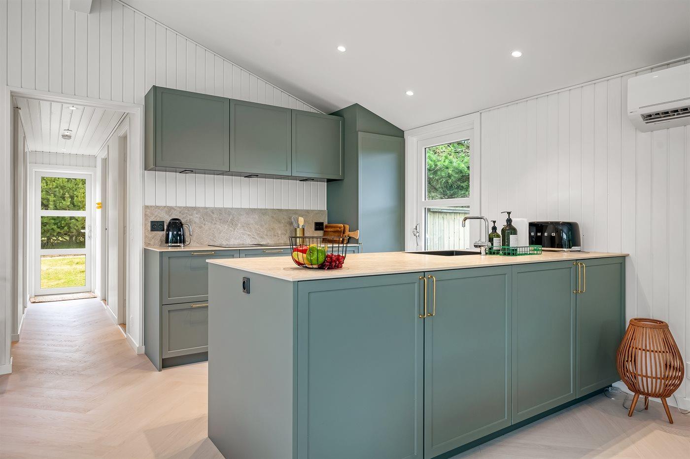 Køkkenet er udstyret med 1 køleskab. Der er 4 induktionskogeplader, varmluftovn, mikrobølgeovn samt opvaskemaskine.