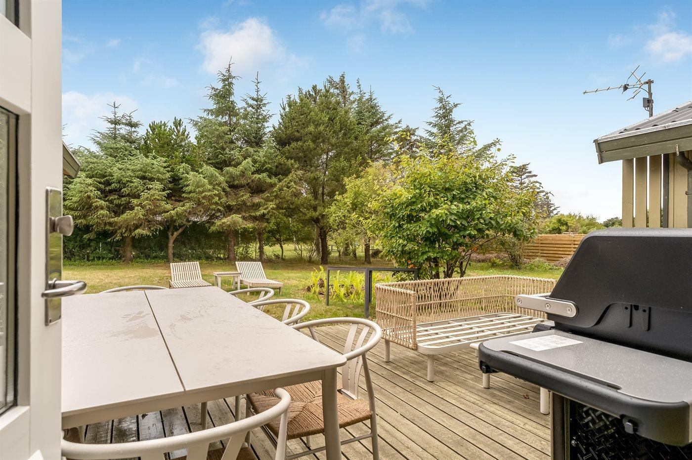 Udenfor finder du en stor, lækker terrasse, hvor du kan nyde solen dagen lang – helt uforstyrret på den lukkede og ugenerede grund. Perfekt til grillhygge, afslapning med en god bog eller leg med børnene.