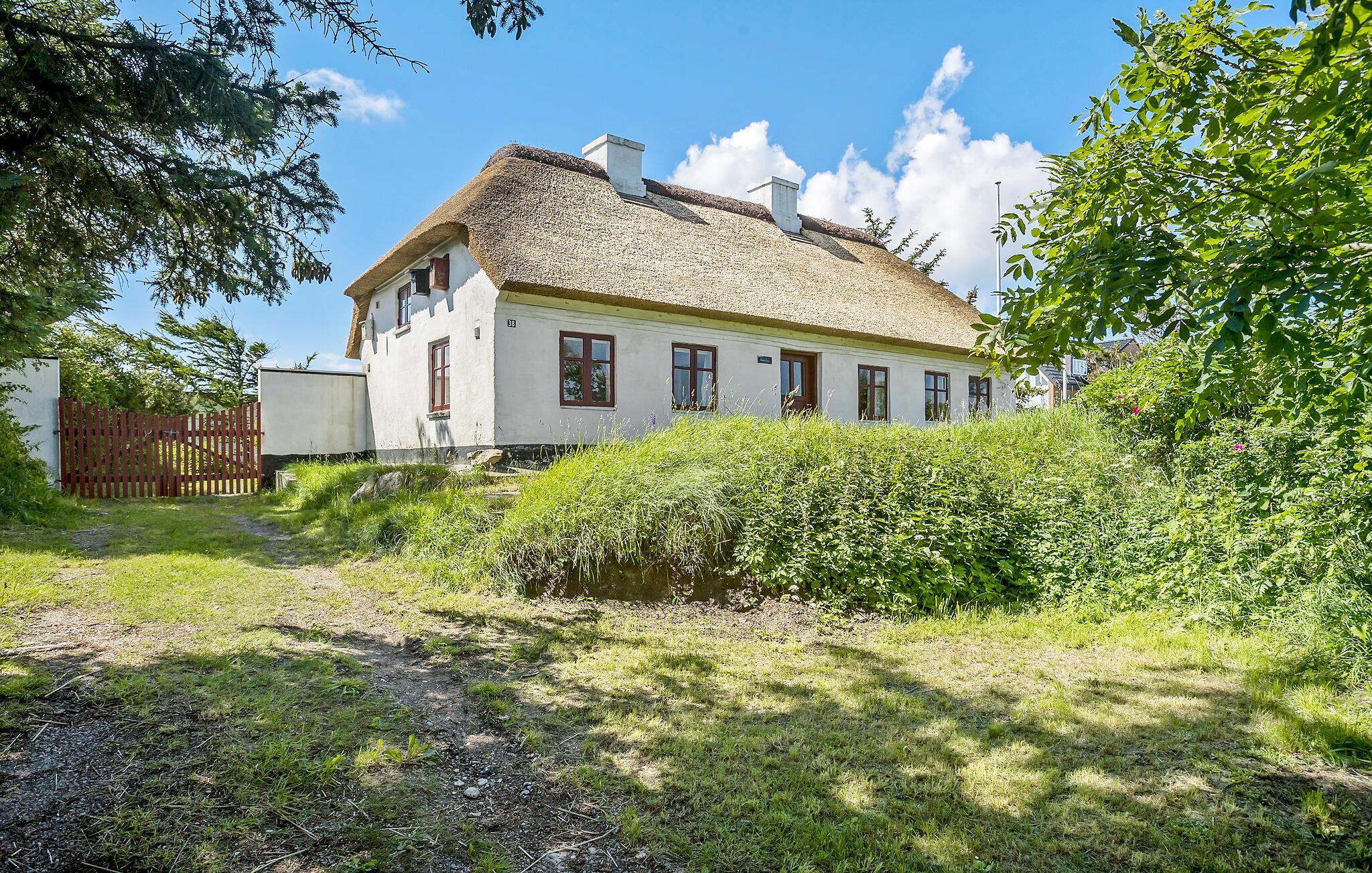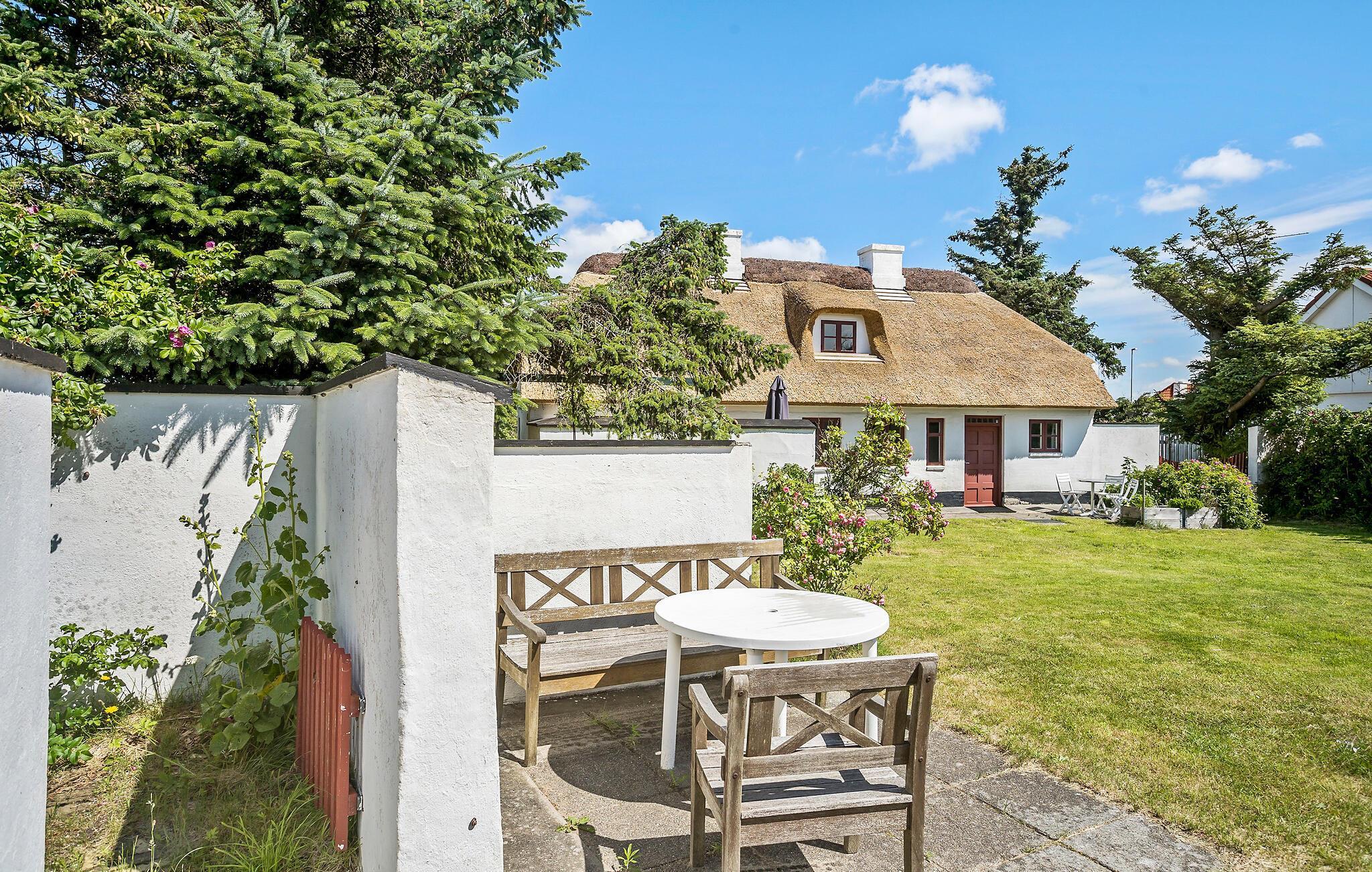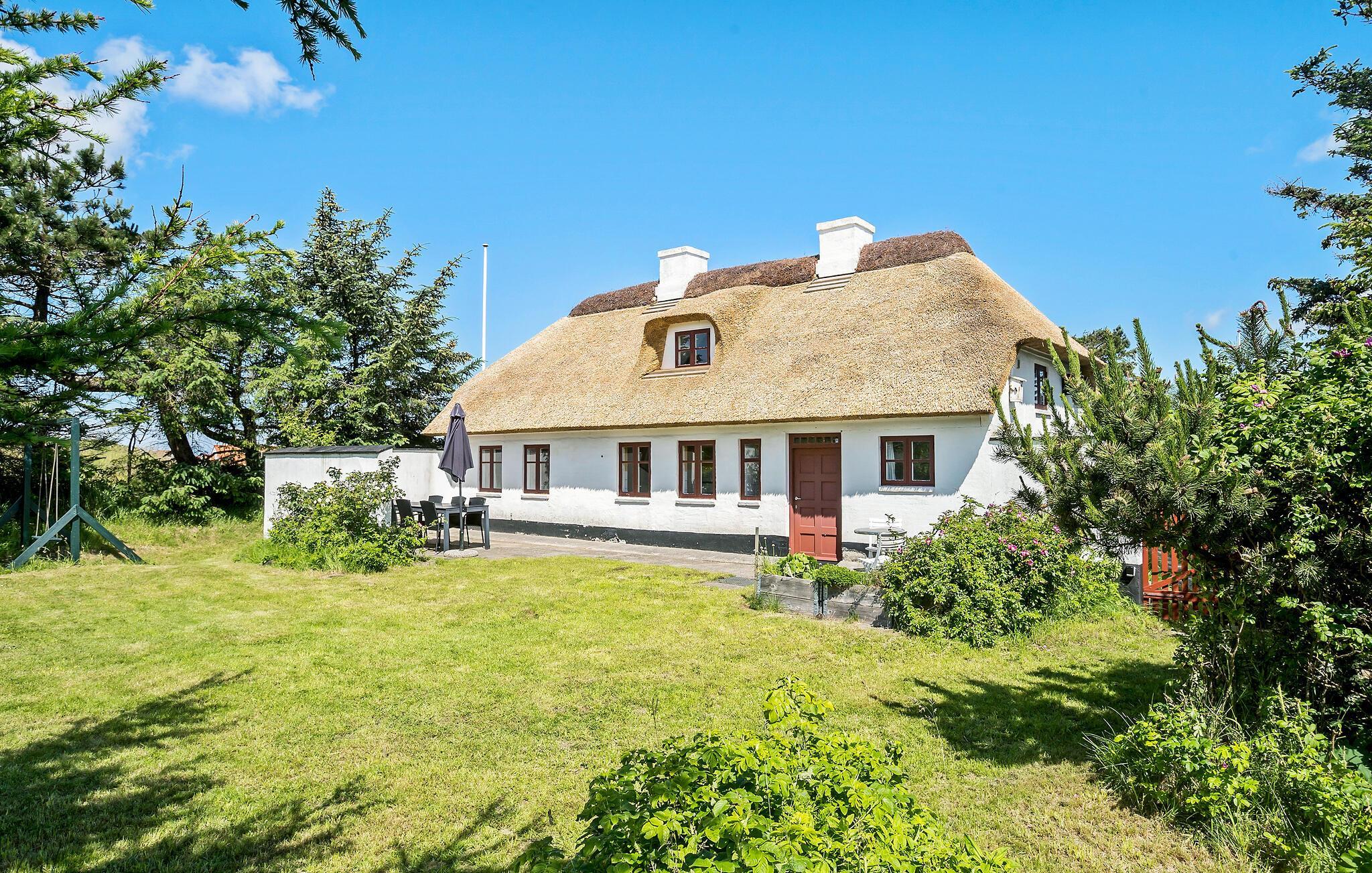Charmerende stråtækt feriehus i Blokhus nær Vesterhavet med hyggelig atmosfære og skøn have.
