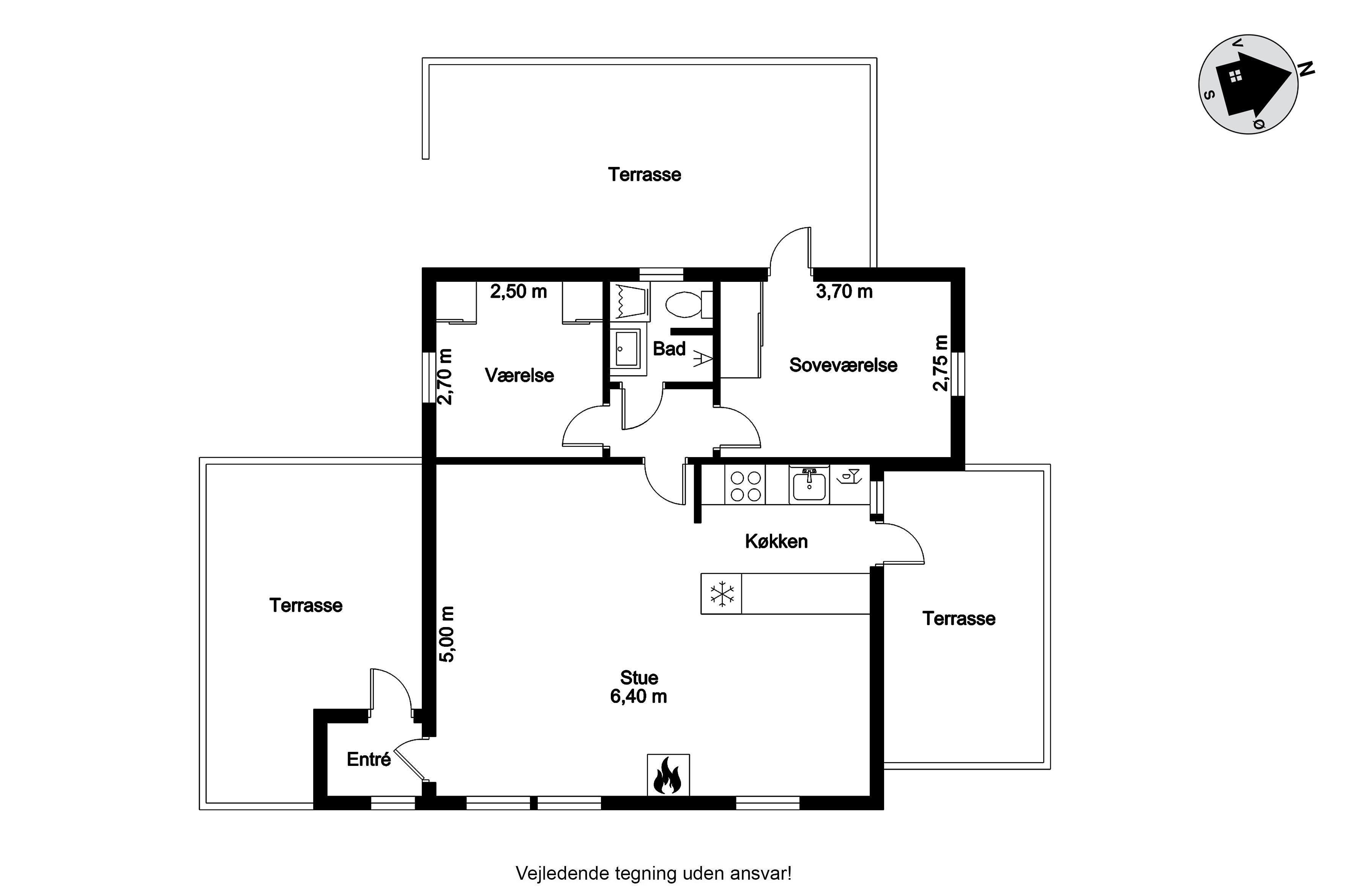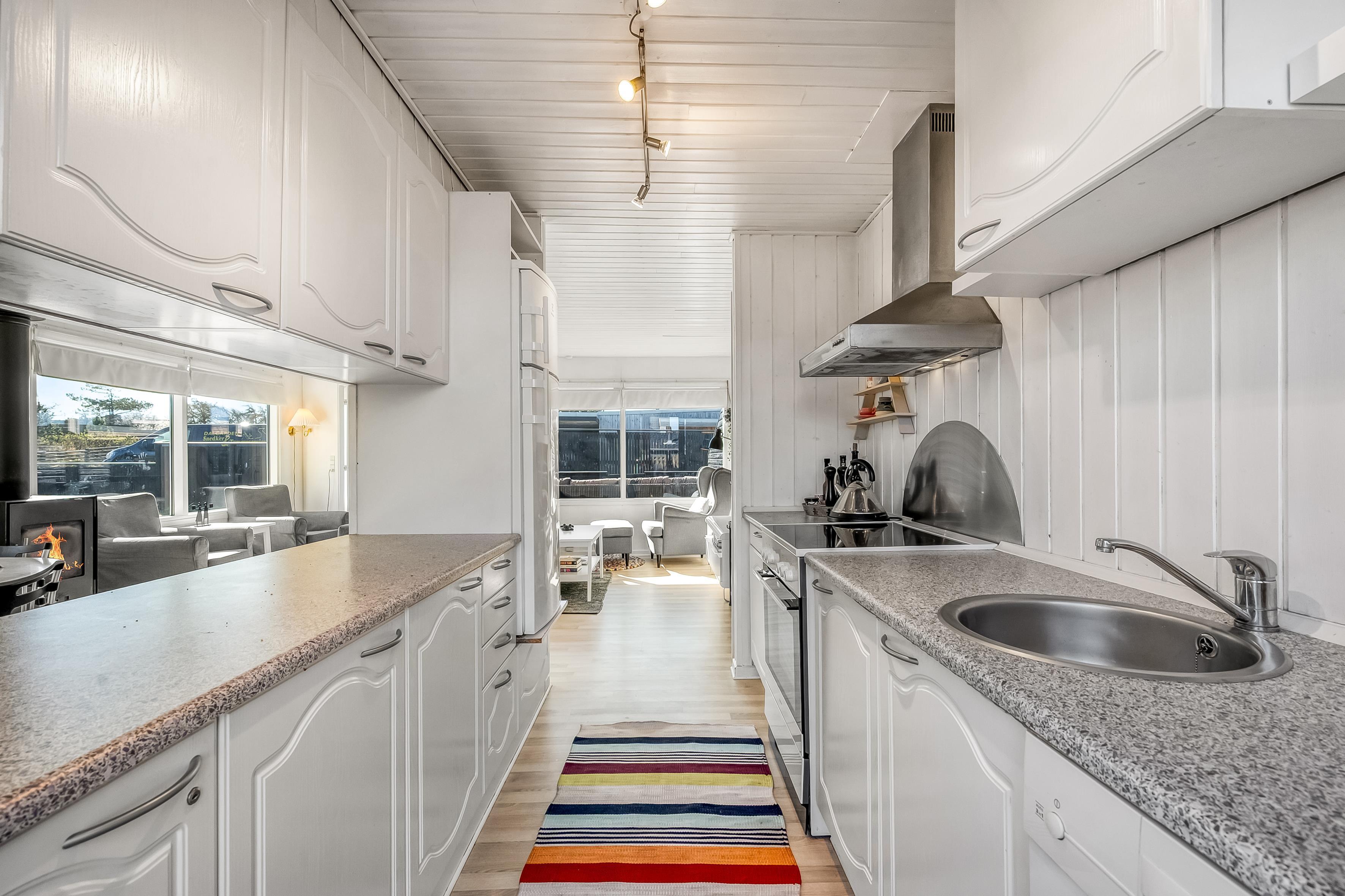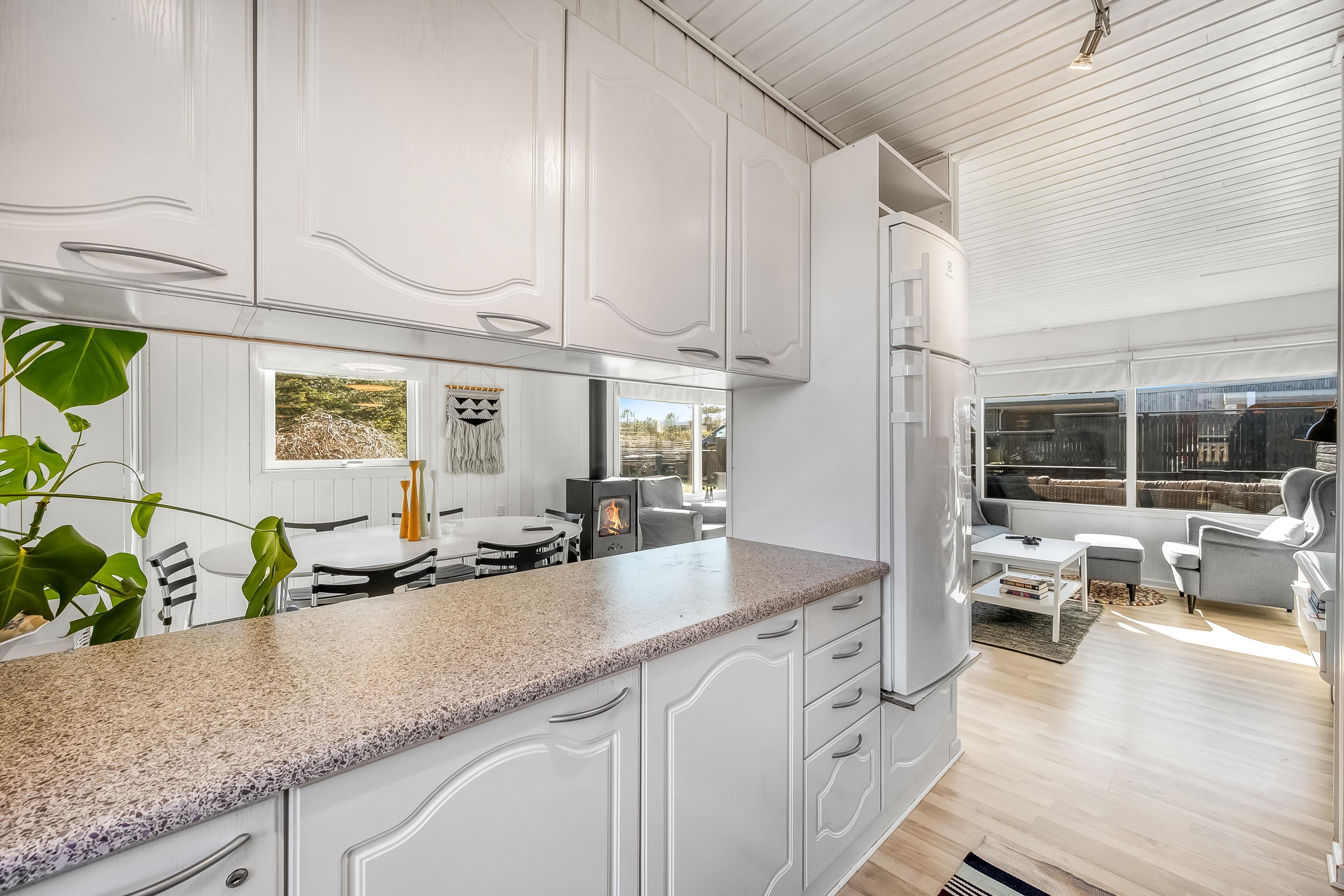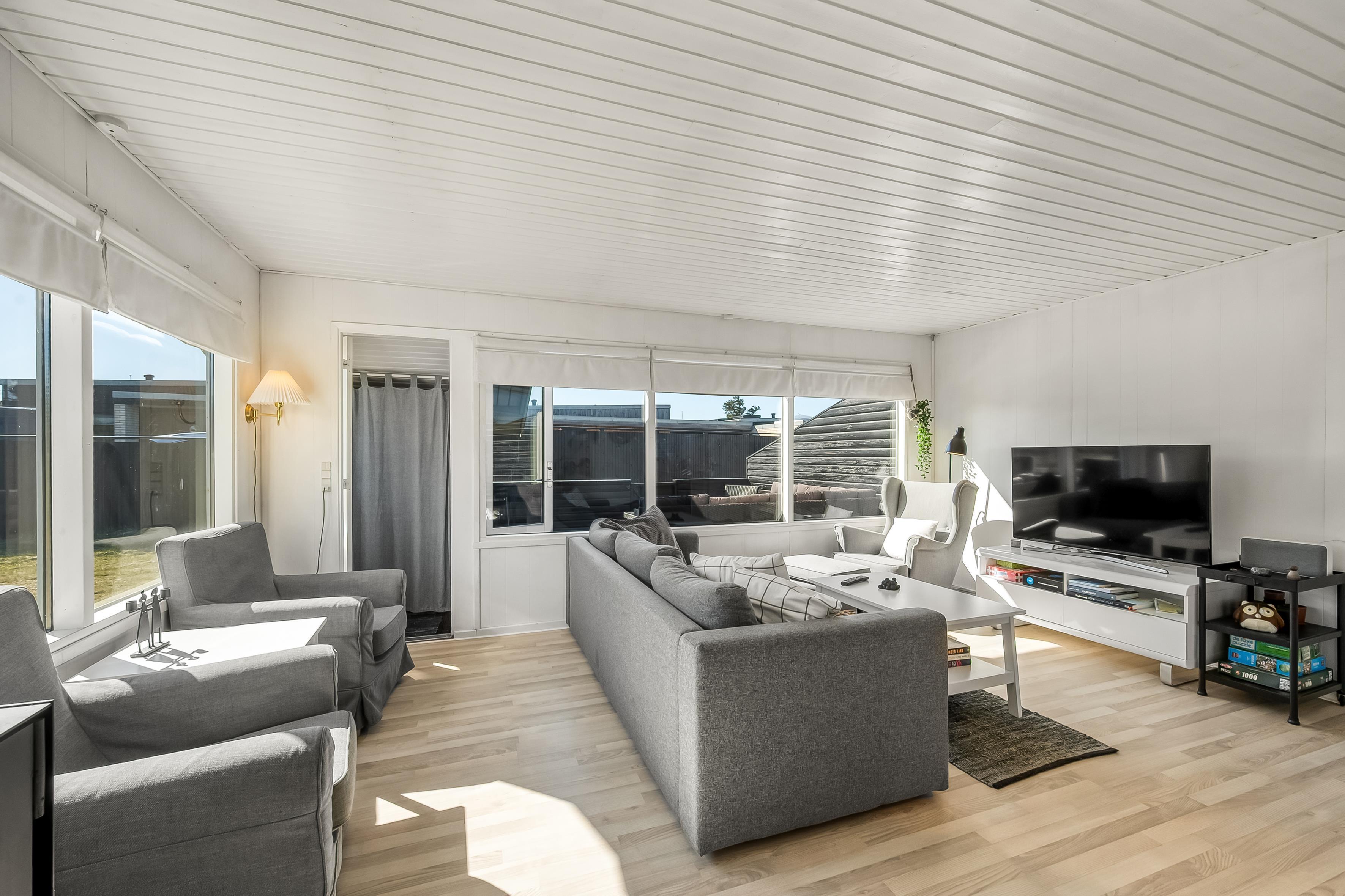 Er du til traditionel sommerhushygge, som man kender det fra barnsben, er denne feriebolig oplagt at leje. Huset er med sine 60 kvm rigtig hyggeligt og kan huse 4 personer + en baby. Fra forgangen tilgår du den dejlige, lyse stue med brændeovn, trægulve og åben forbindelse til køkkenet. Her er både udgang til den afskærmede sydvendte terrasse og fra køkkenet tilgår du den anden terrasse. Badeværelset er moderniseret, og ellers står huset som det blev bygget i 1970. Der er 2 soveværelser, hvoraf det ene har udgang til den vestvendte terrasse.
