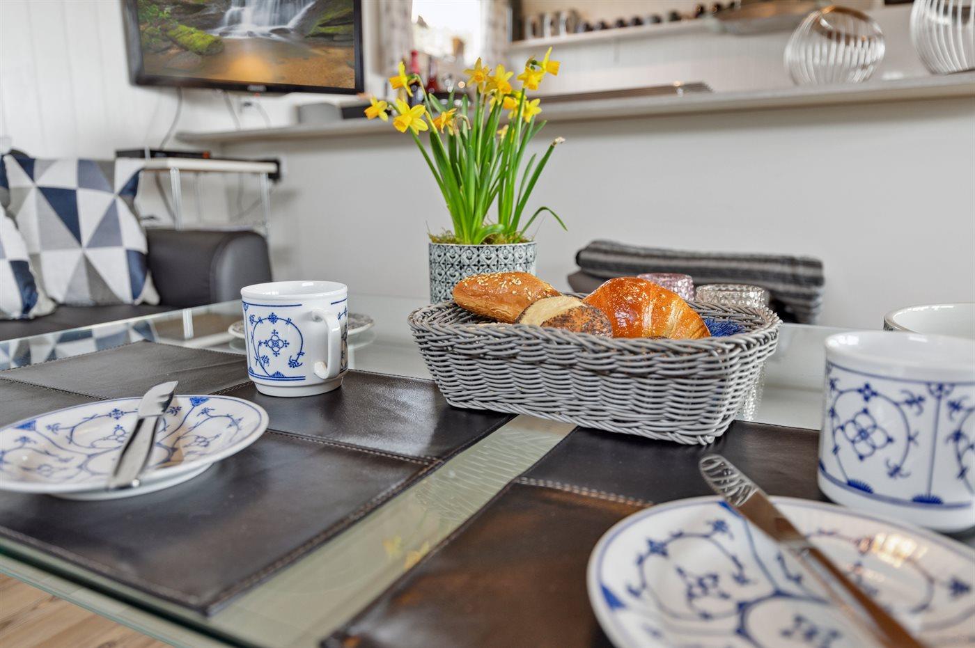 Køkkenet er udstyret med 1 køleskab. Der er 4 keramiske kogeplader, varmluftovn, mikrobølgeovn samt opvaskemaskine.