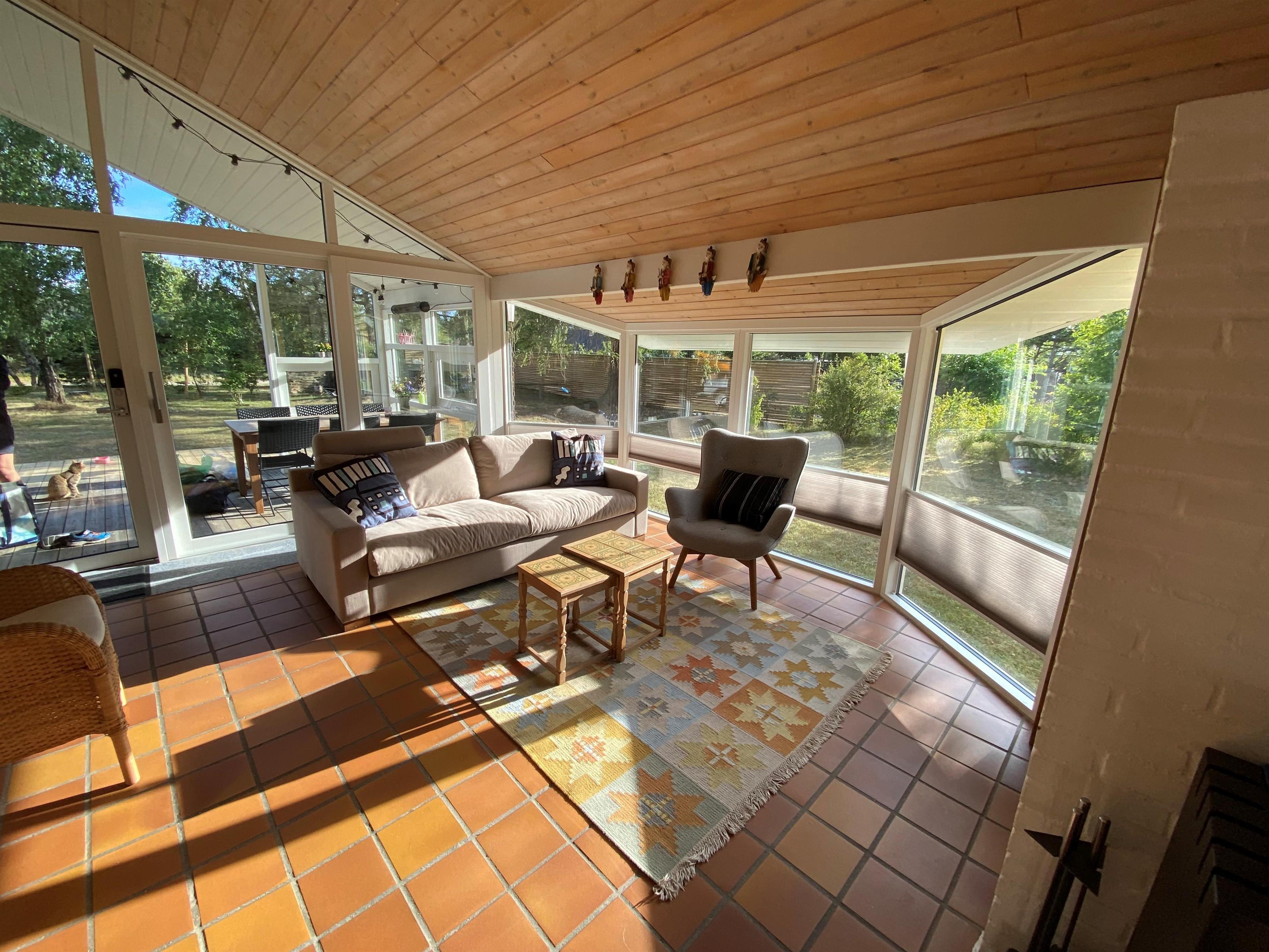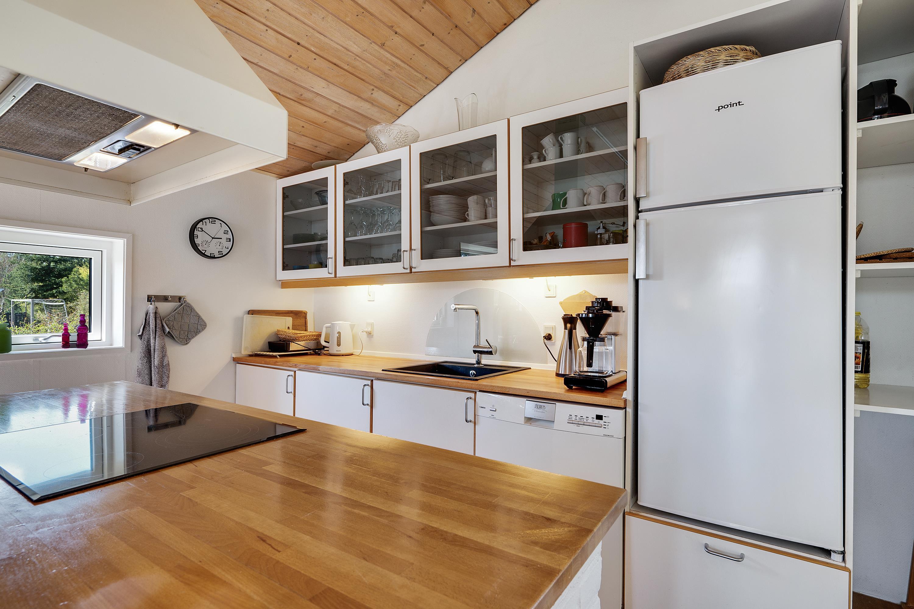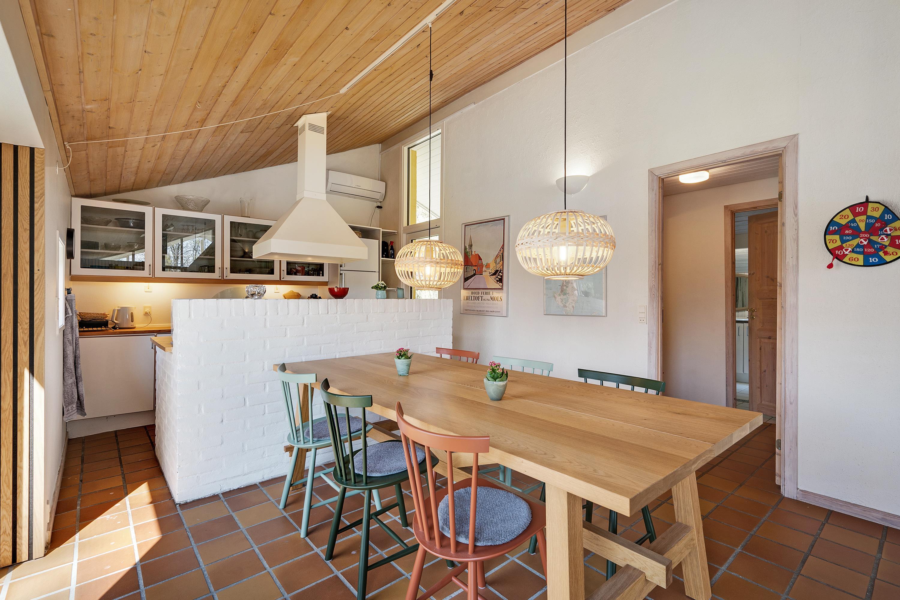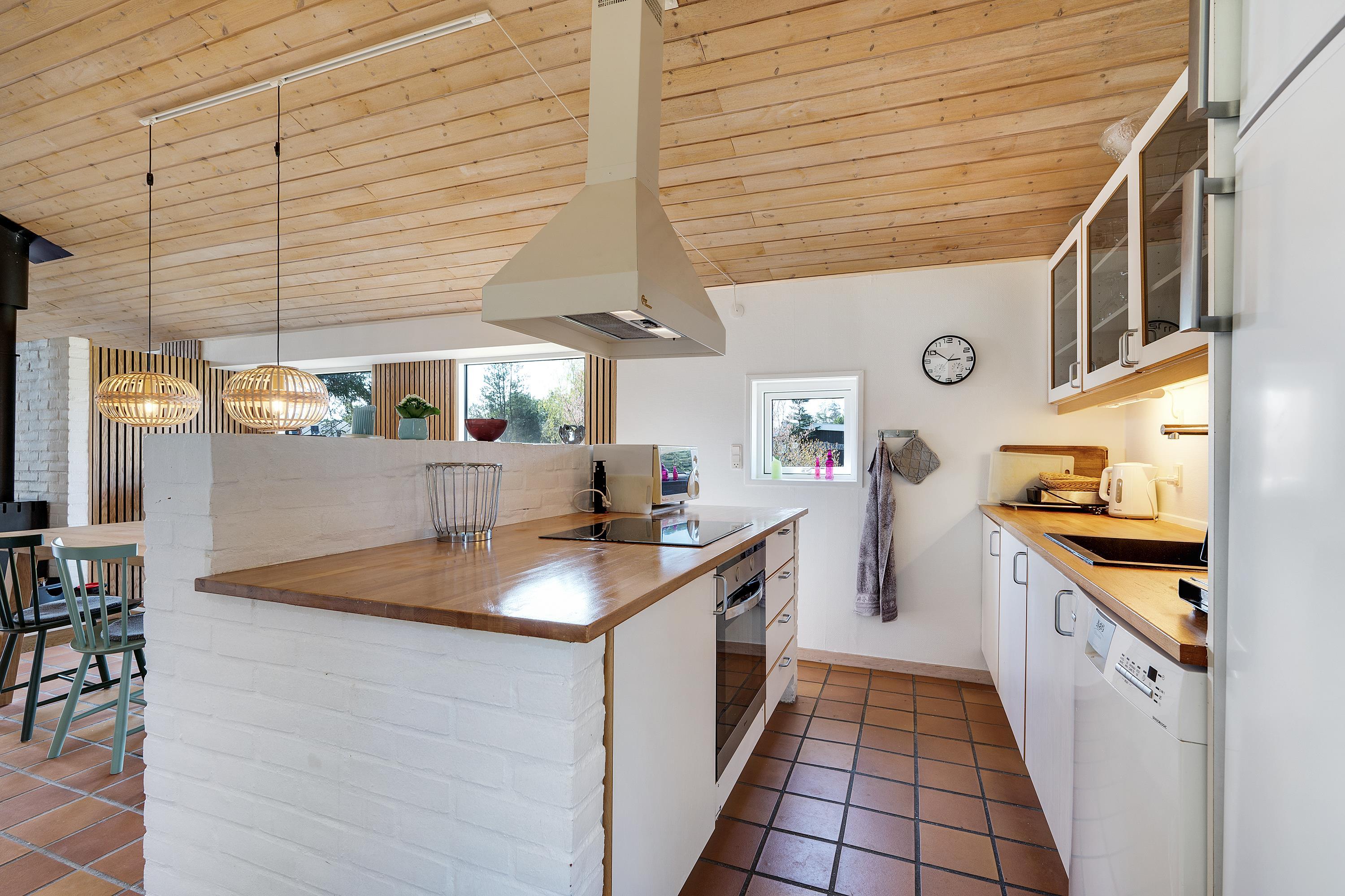Dejligt sommerhus beliggende på åben naturgrund med gode læforhold samt delvis overdækket terrasse med havemøbler og grill. Hyggelig, lys opholdsstue med stort vinduesparti samt brændeovn, TV (inkl. TV2), samt gulvvarme. Dejligt, funktionelt og lyst køkken med udgang til bagterrasse, keramisk komfur, køleskab med fryser, mikrobølgeovn og opvaskemaskine samt rummelig spiseplads i direkte forbindelse med køkkenet. Desuden ekstra fryser. Godt badeværelse med brusekabine, vaskemaskine og tørretumbler. Gæstetoilet med håndvask. Husets sovepladser fordeler sig på 3 soverum: 1 med ny dobbeltseng, 1 med ny dobbeltseng og 1 med 2 køjesenge. Til de små feriegæster findes barnestol. Et virkelig skønt sommerhus tæt på vandet og i et område med mange aktivitetsmuligheder. Trådløst internet. Energivenlig varmepumpe.
