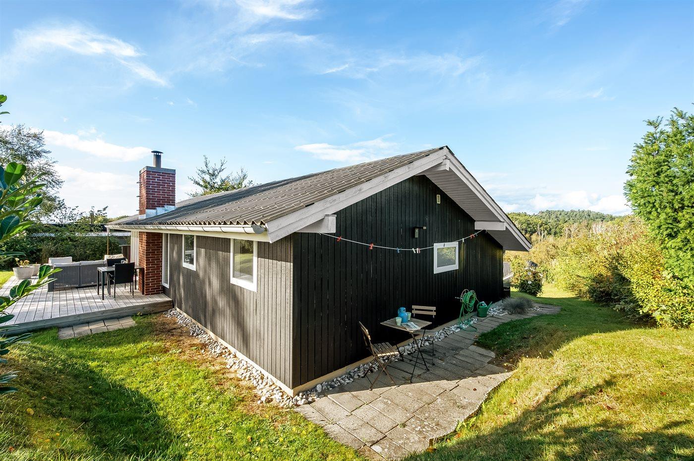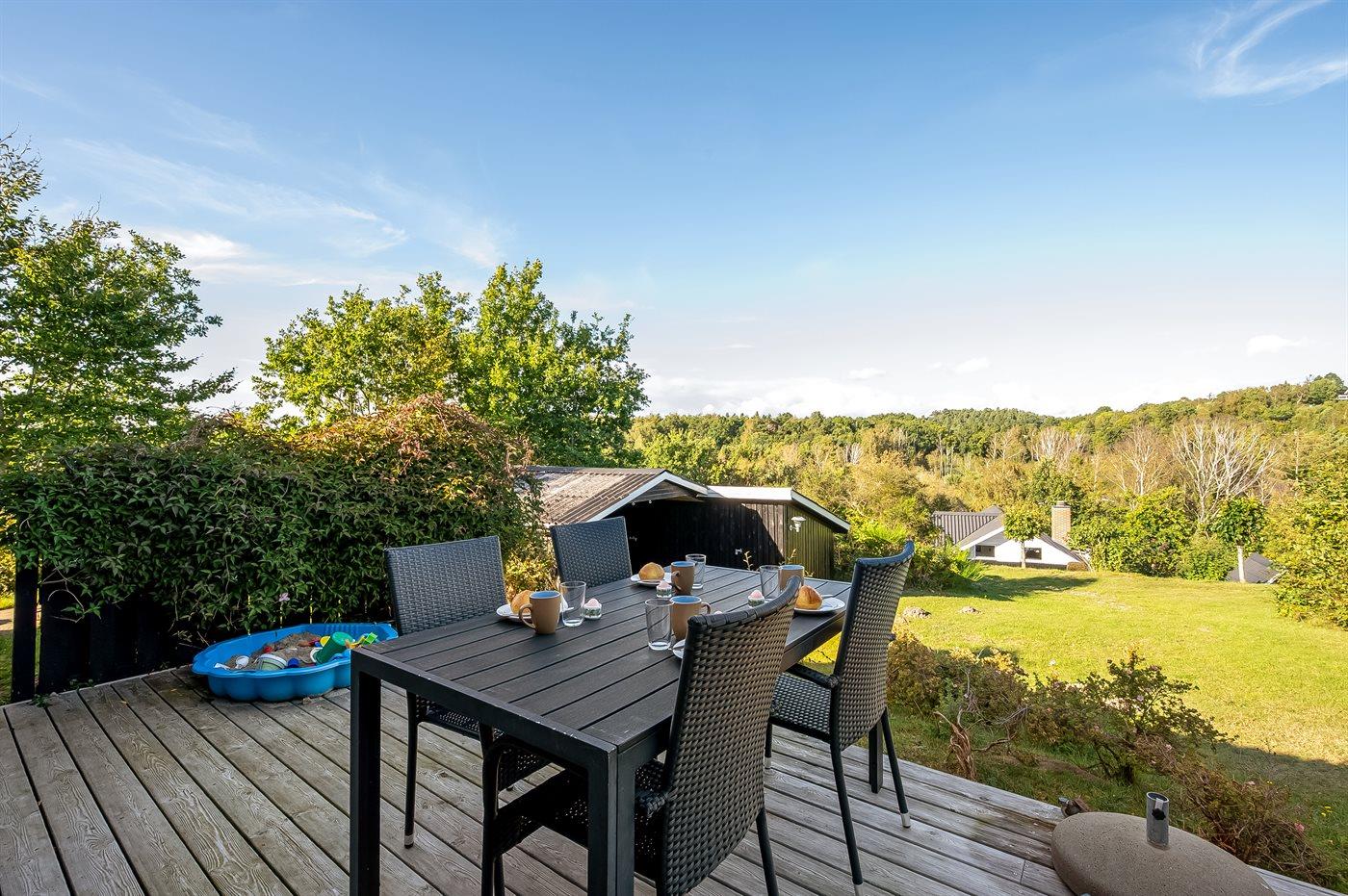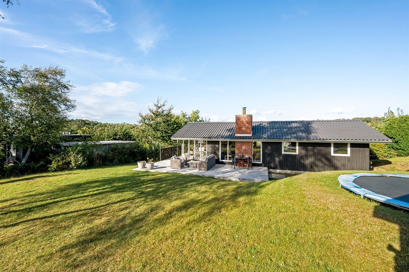 Sommerhuset ligger ganske ugenert på en stor og skøn naturgrund, hvorfra udsigten udover landskabet er helt fantastisk. På flere side af huset er der nogle utrolig gode terrassearealer - således der altid er mulighed for at nyde solen og finde et hjørne i læ, hvis vejret ikke helt skulle arte sig. Den ene af terrasserne er endda overdækket.