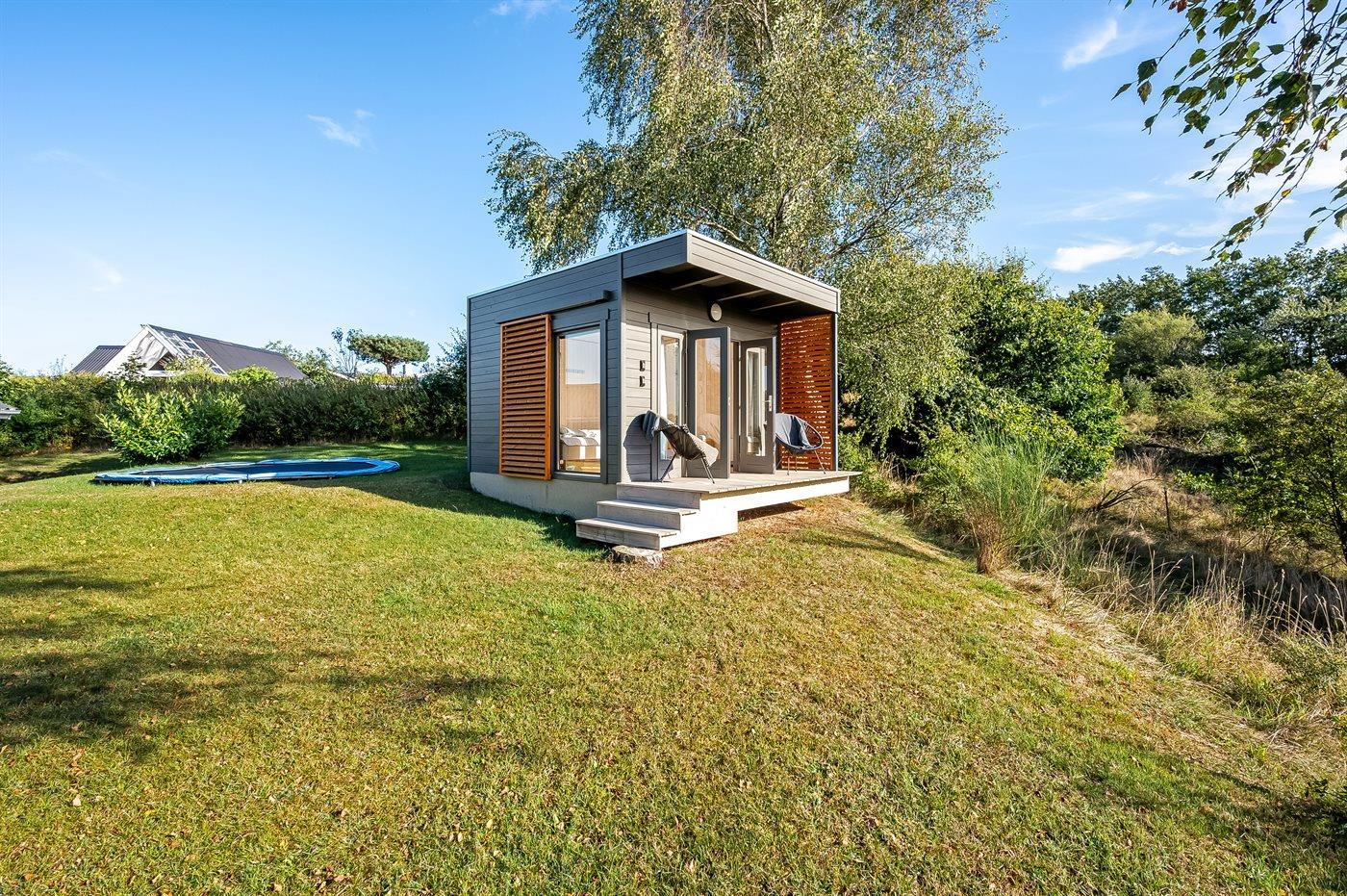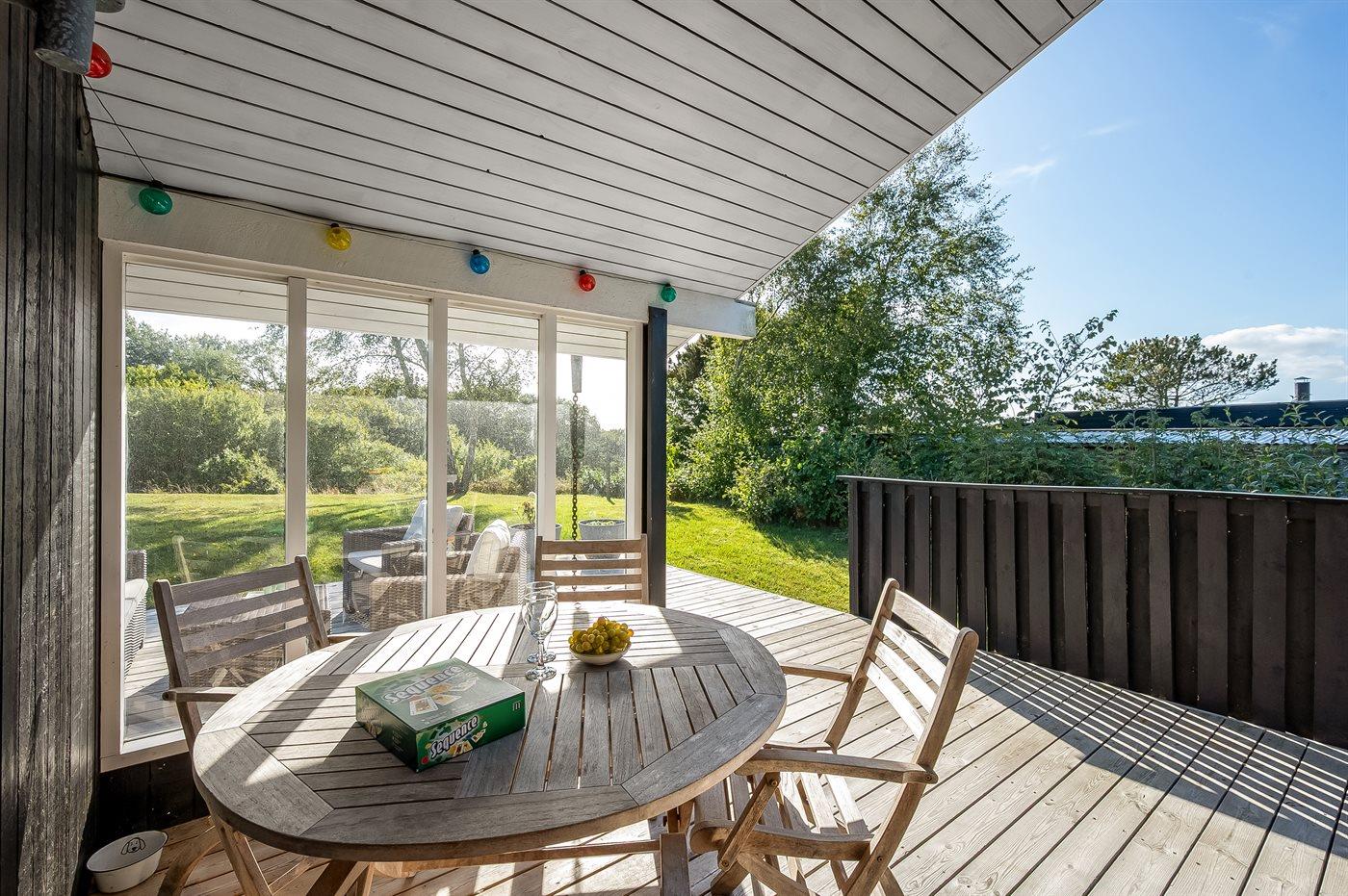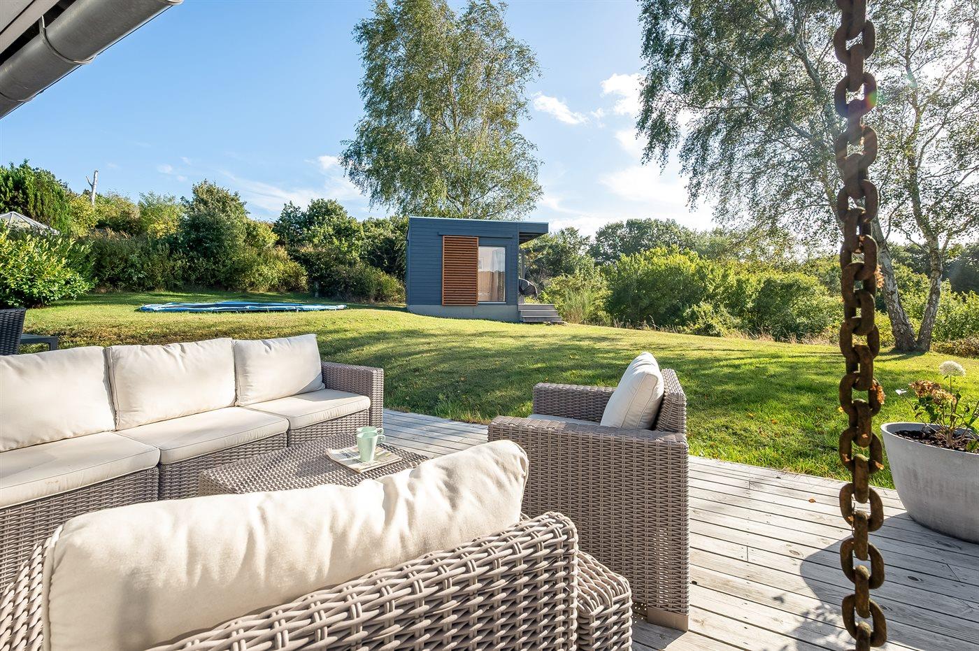 Sommerhuset ligger ganske ugenert på en stor og skøn naturgrund, hvorfra udsigten udover landskabet er helt fantastisk. På flere side af huset er der nogle utrolig gode terrassearealer - således der altid er mulighed for at nyde solen og finde et hjørne i læ, hvis vejret ikke helt skulle arte sig. Den ene af terrasserne er endda overdækket.
