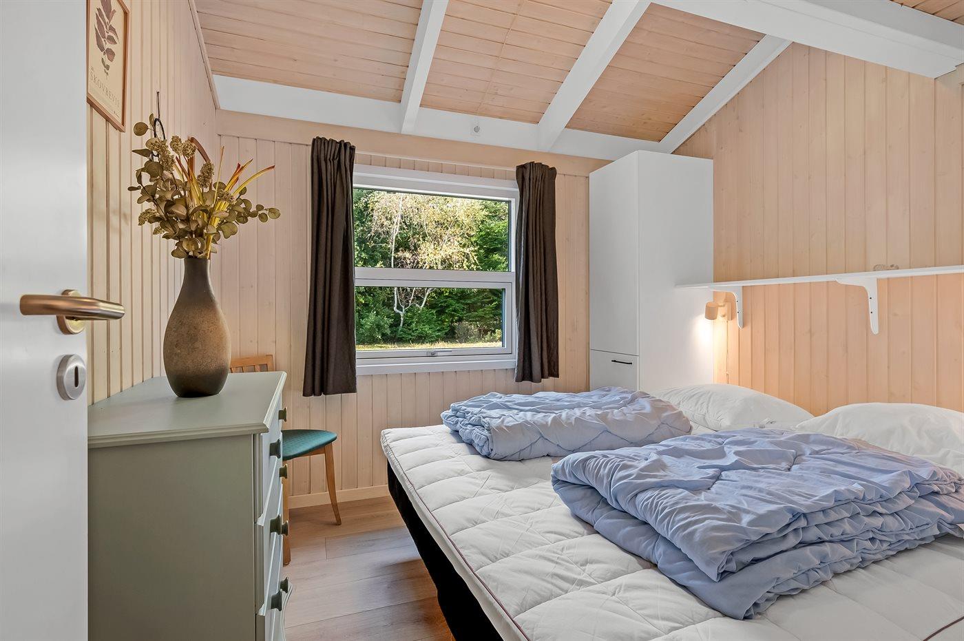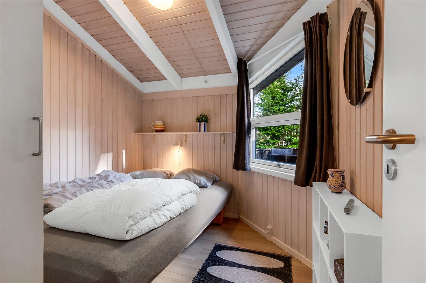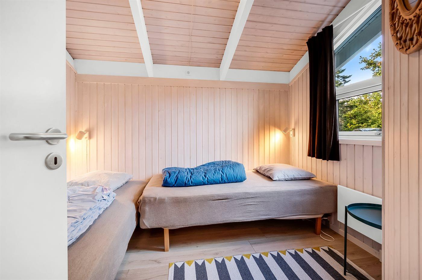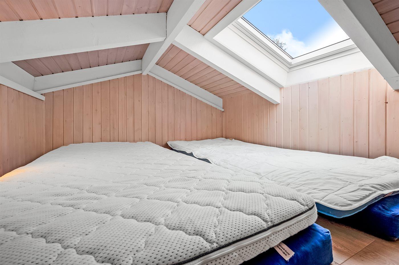 Der er i alt 4 soveværelser. Sovepladserne fordeler sig på: 4 sovepladser i dobbeltsenge. 4 sovepladser i enkeltsenge. 2 sovepladser på madrasser. 2 af disse sovepladser befinder sig på husets hems.