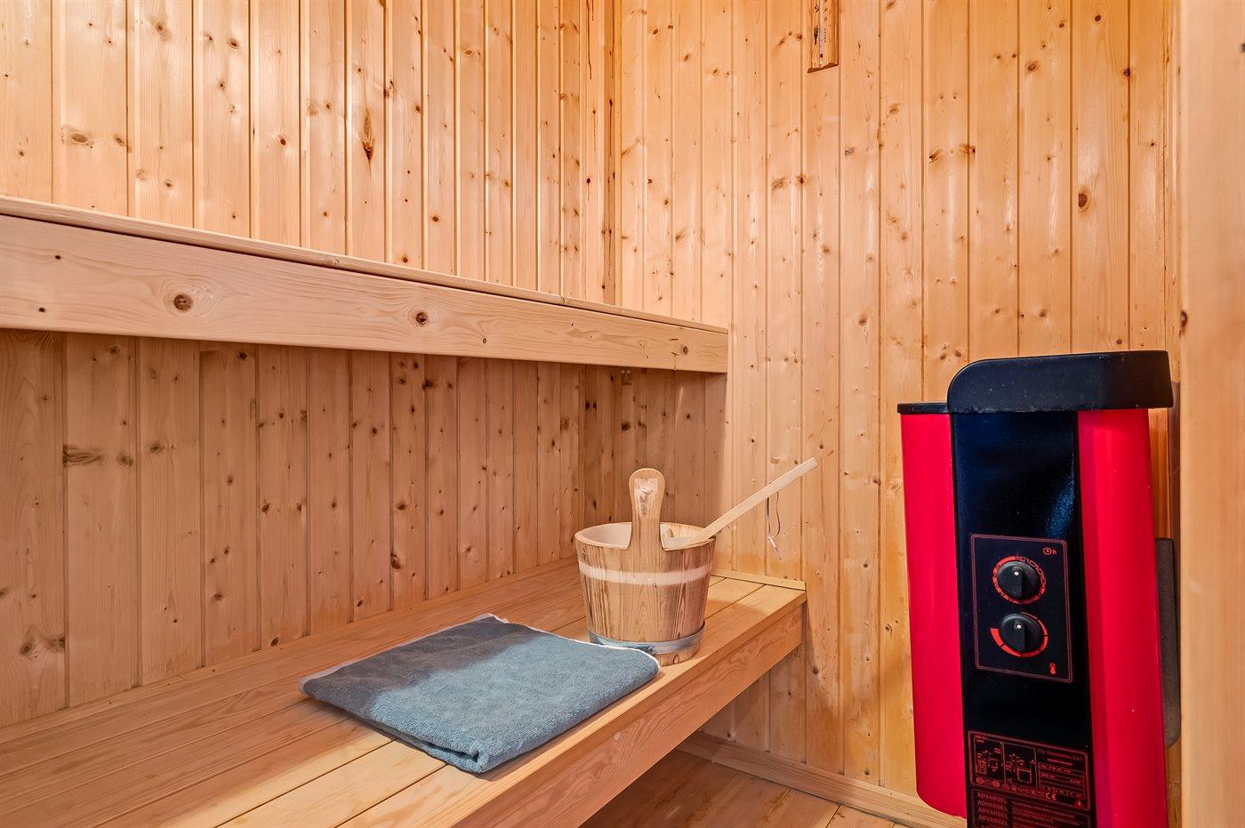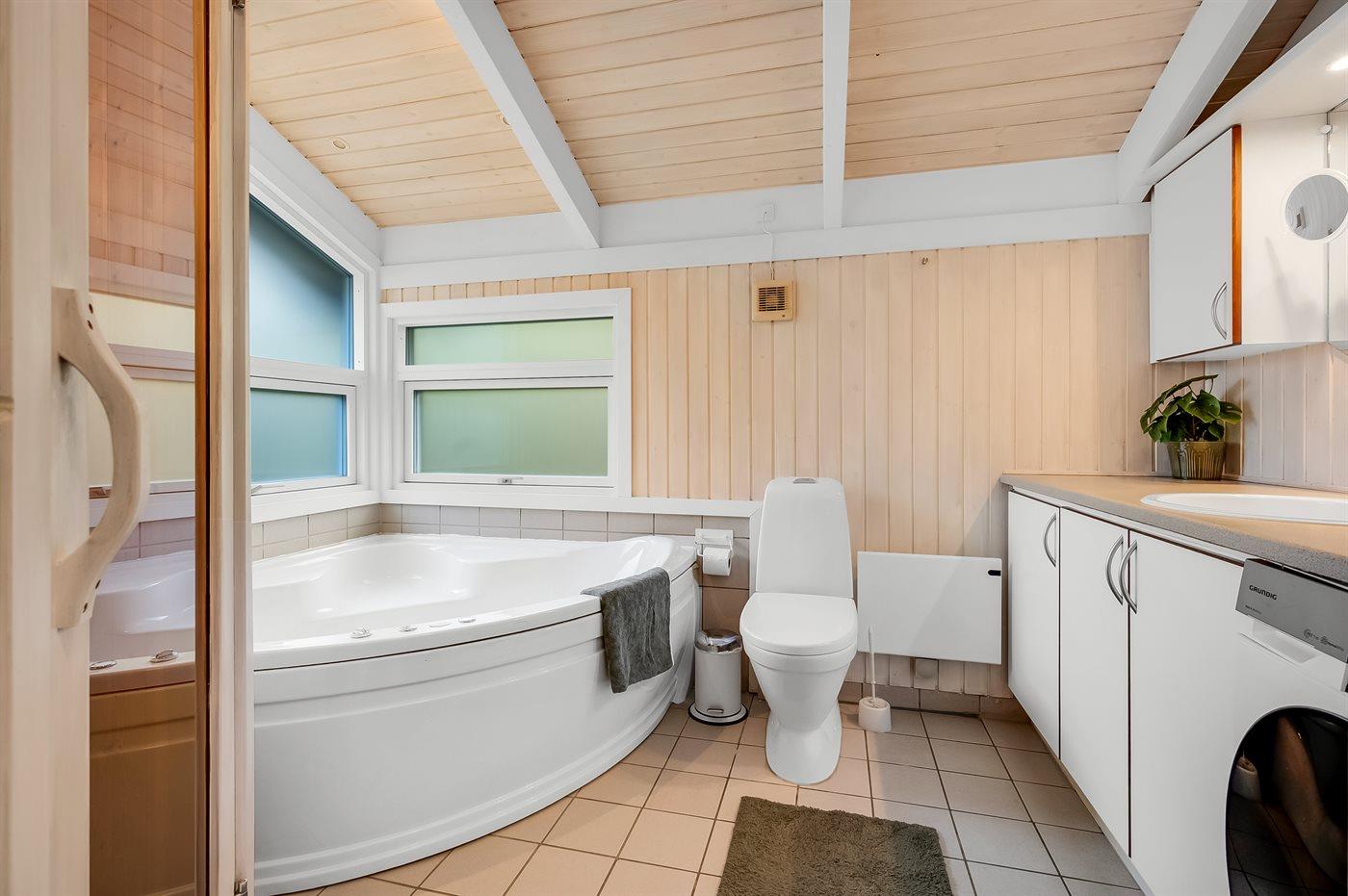 Der er 2 badeværelser med bruseniche og 2 toiletter. Der er gulvvarme på 2 badeværelser.. Badekar. I saunaen er der mulighed for afslapning.