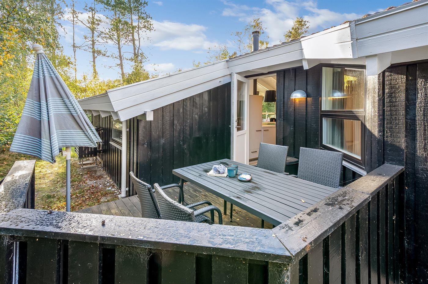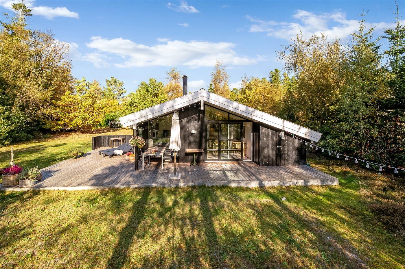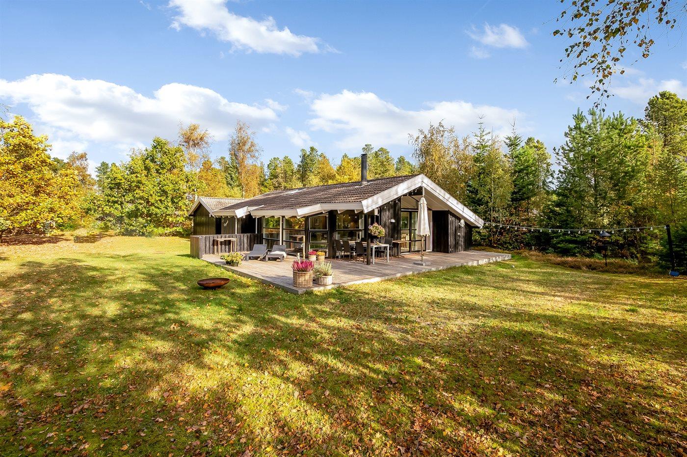 Flot feriehus nær Boeslum Strand med sauna, brændeovn og flere terrasser på stor naturgrund.