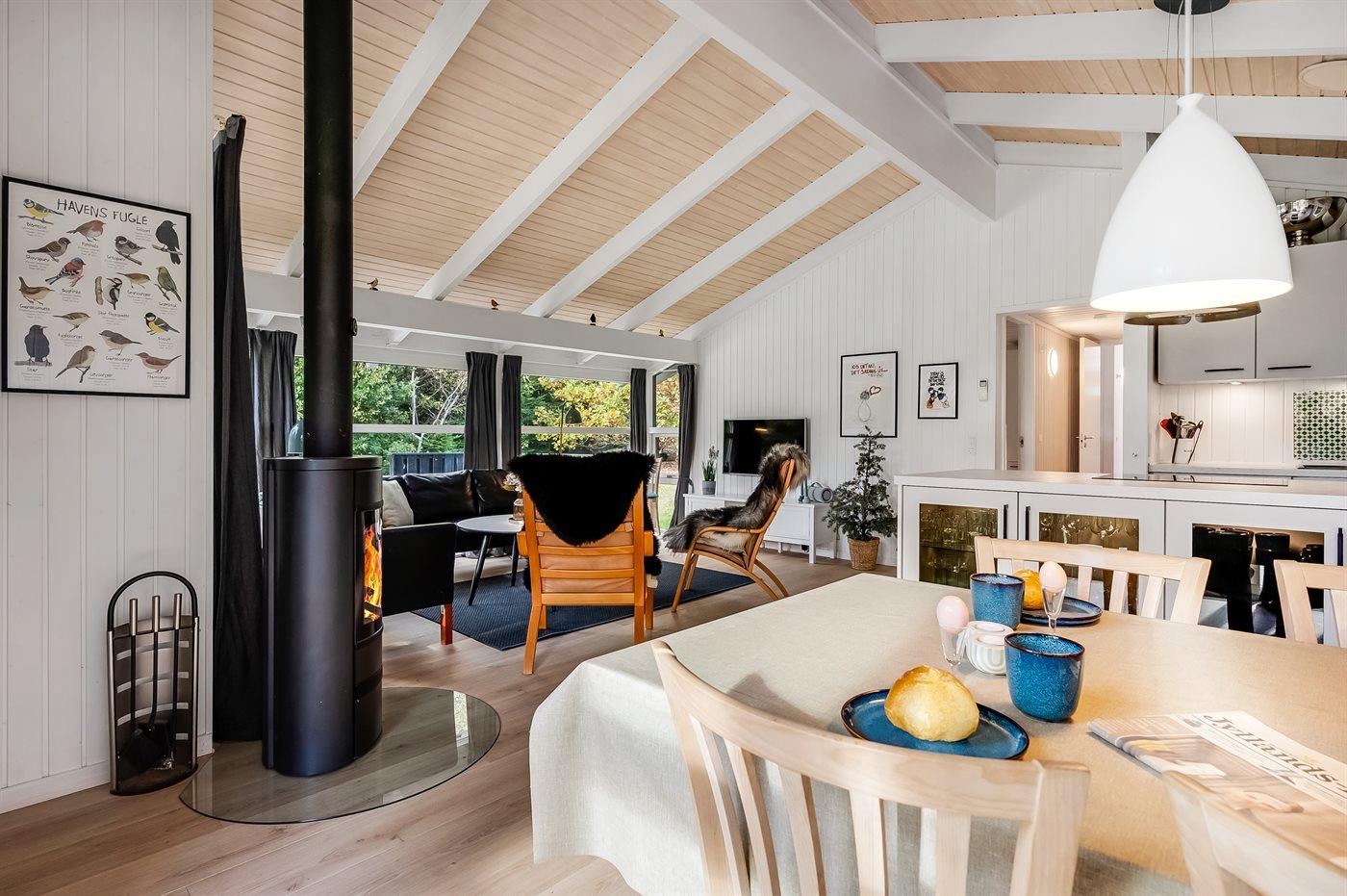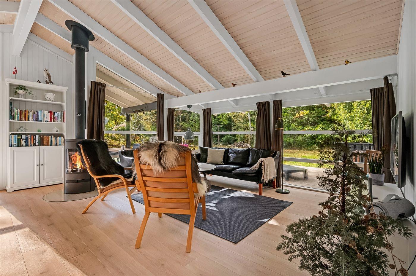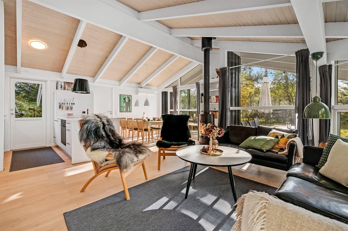 Huset byder på en indbydende stue med gode møbler, brændeovn og varmepumpe – et hyggeligt samlingspunkt på alle årstider. Fra stuen er der direkte adgang til en overdækket terrasse med havemøbler, hvor man kan nyde roen og den friske havluft.