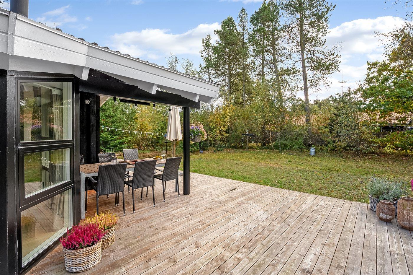 Huset ligger tilbagetrukket på en skøn naturgrund med god plads til leg og udendørs aktiviteter. Her finder du flere solrige terrasseområder med havemøbler og grill, så rammerne er på plads for hyggelige stunder udendørs.