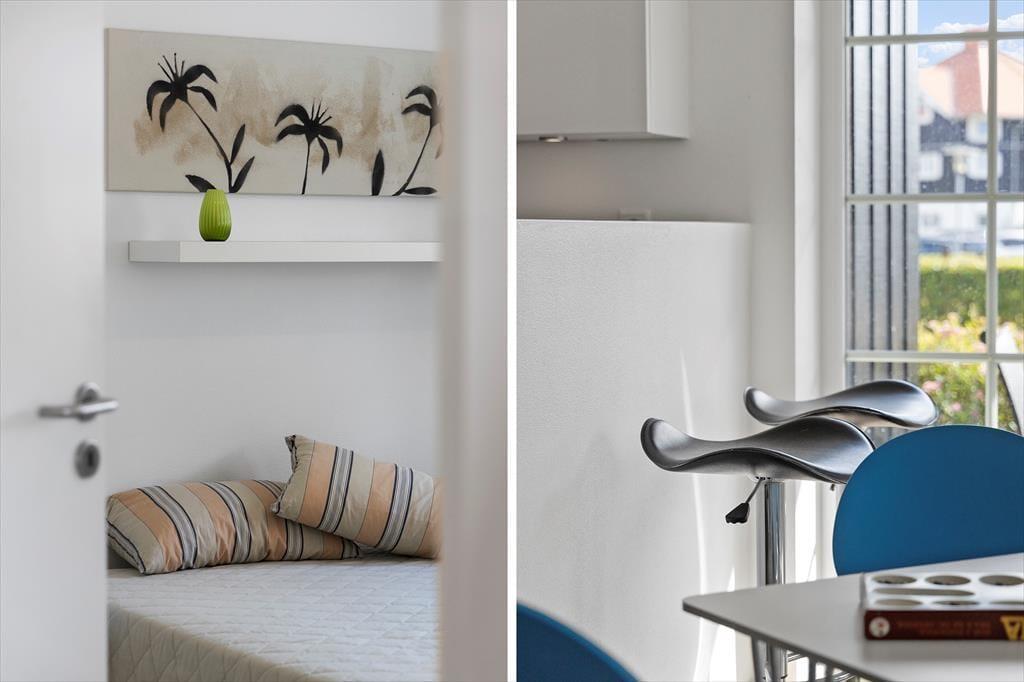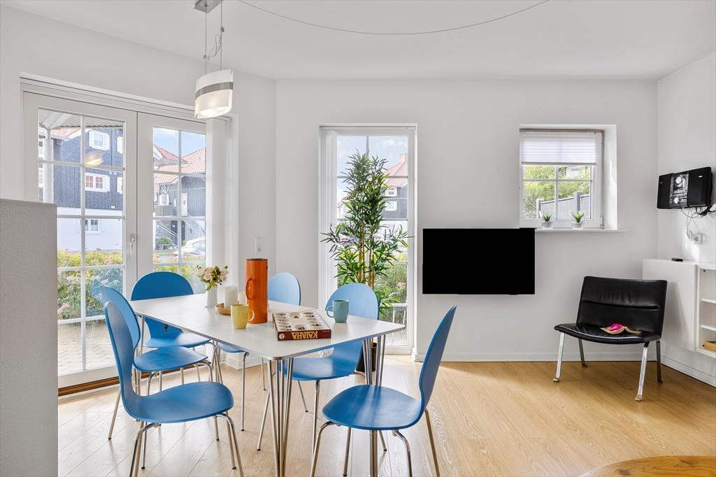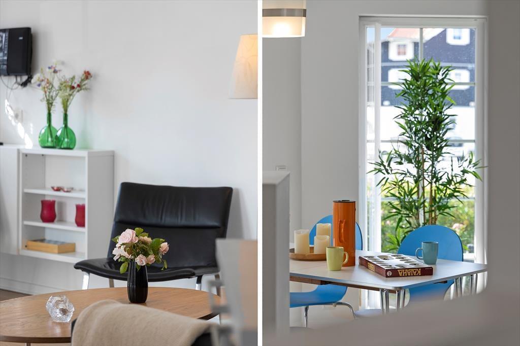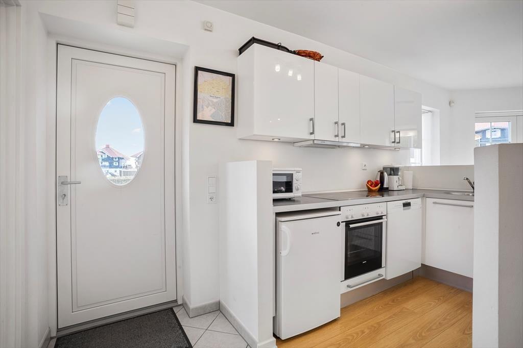 Lejligheden er funktionelt indrettet med et åbent køkken og opholdsområde, hvor du nemt kan lave mad og nyde dagens måltider i ro og mag. Stilen er lys og enkel, og boligen byder på alt det, du har brug for på ferien – både til korte og længere ophold. Den er ideel til to voksne og 2 børn, og den praktiske indretning gør det nemt at finde sig til rette. Du har desuden adgang til fællesarealerne omkring ejendommen, som byder på grønne omgivelser og plads til leg og udendørs hygge. Her er trygge og rolige rammer, hvor ferien kan leves i et behageligt tempo.