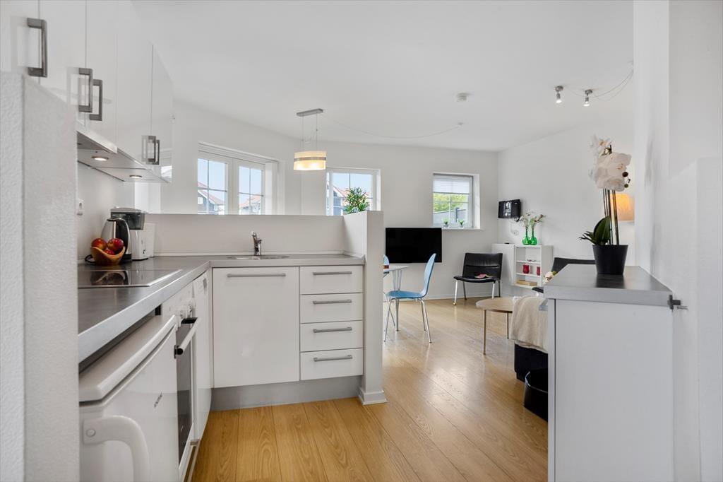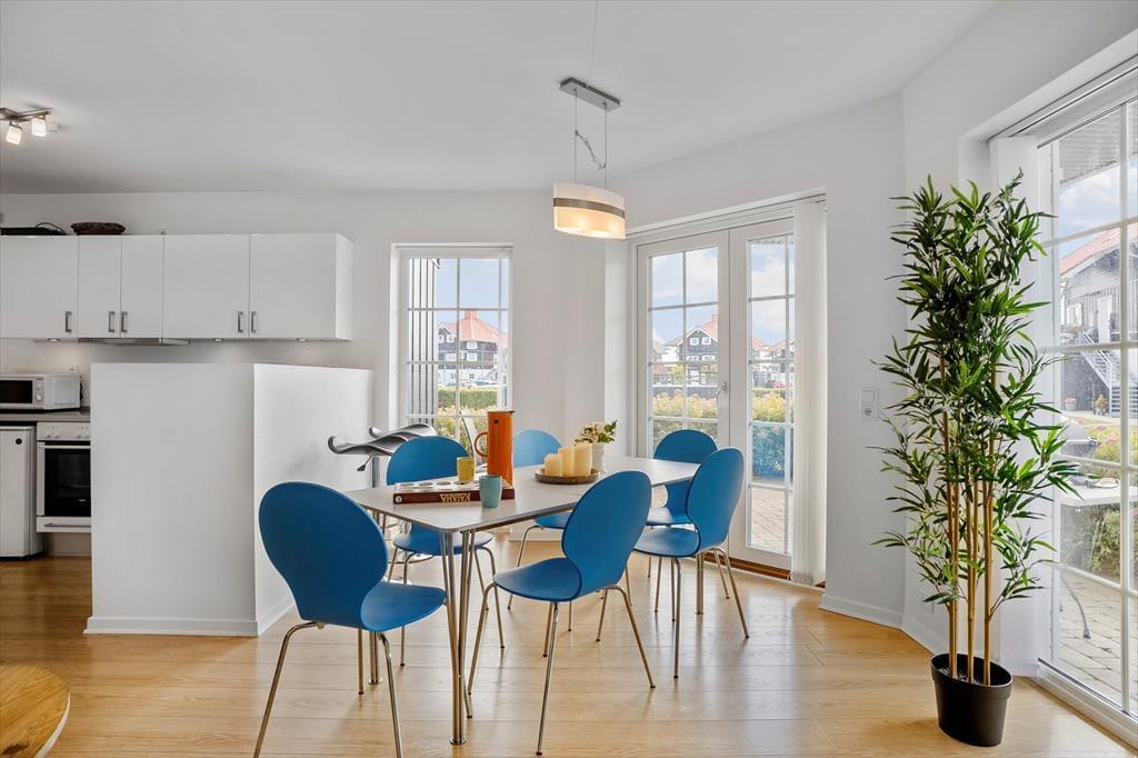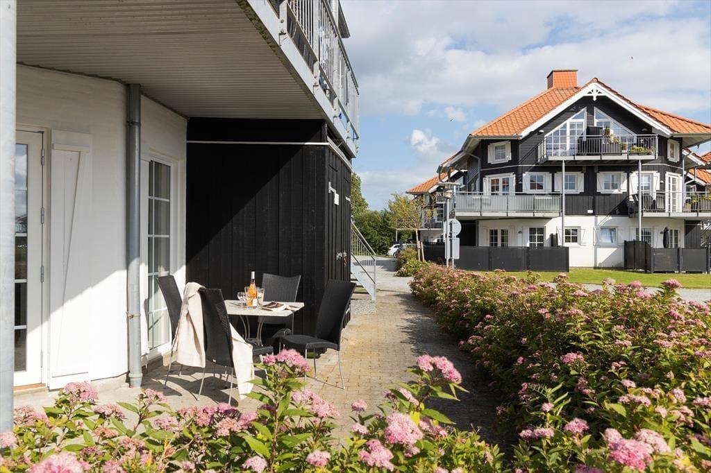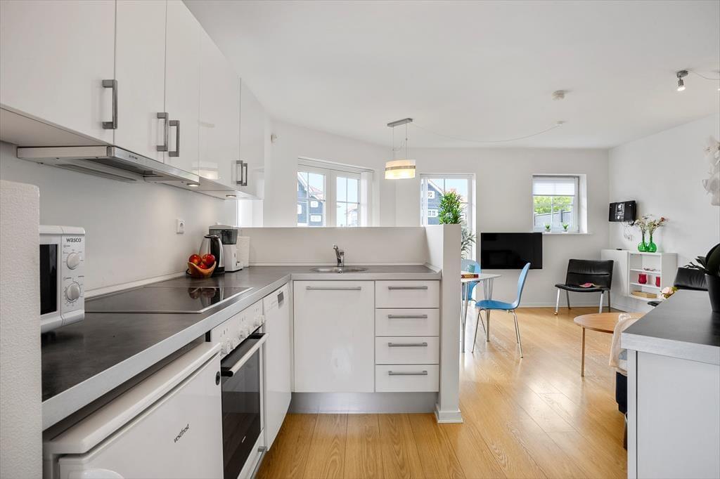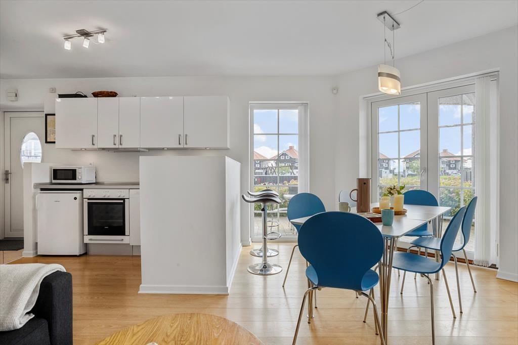 Lejligheden er funktionelt indrettet med et åbent køkken og opholdsområde, hvor du nemt kan lave mad og nyde dagens måltider i ro og mag. Stilen er lys og enkel, og boligen byder på alt det, du har brug for på ferien – både til korte og længere ophold. Den er ideel til to voksne og 2 børn, og den praktiske indretning gør det nemt at finde sig til rette. Du har desuden adgang til fællesarealerne omkring ejendommen, som byder på grønne omgivelser og plads til leg og udendørs hygge. Her er trygge og rolige rammer, hvor ferien kan leves i et behageligt tempo.