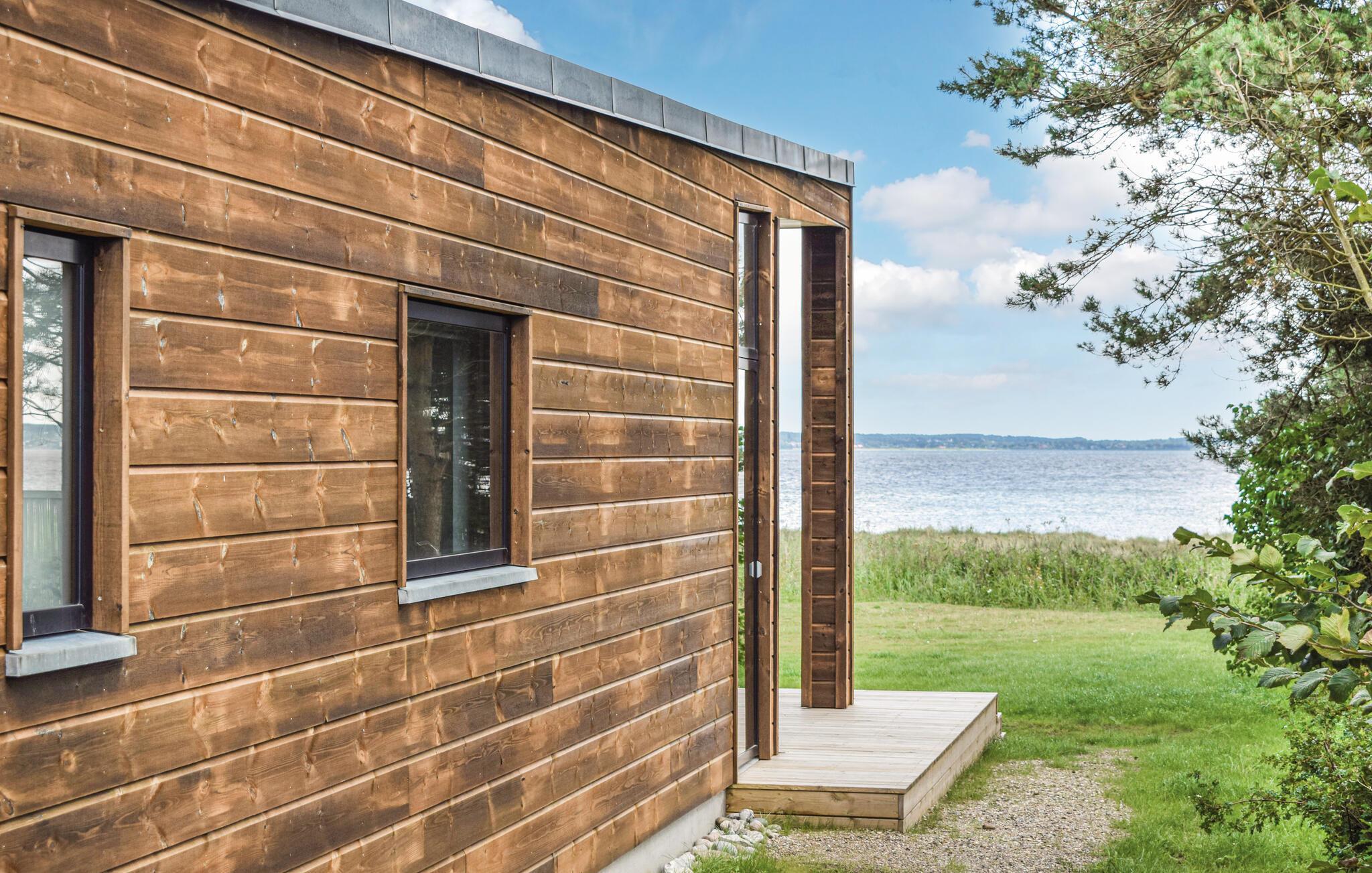 Nyt sommerhus med panoramaudsigt, strandgrund og plads til to familier ved Ebeltoft Vig.