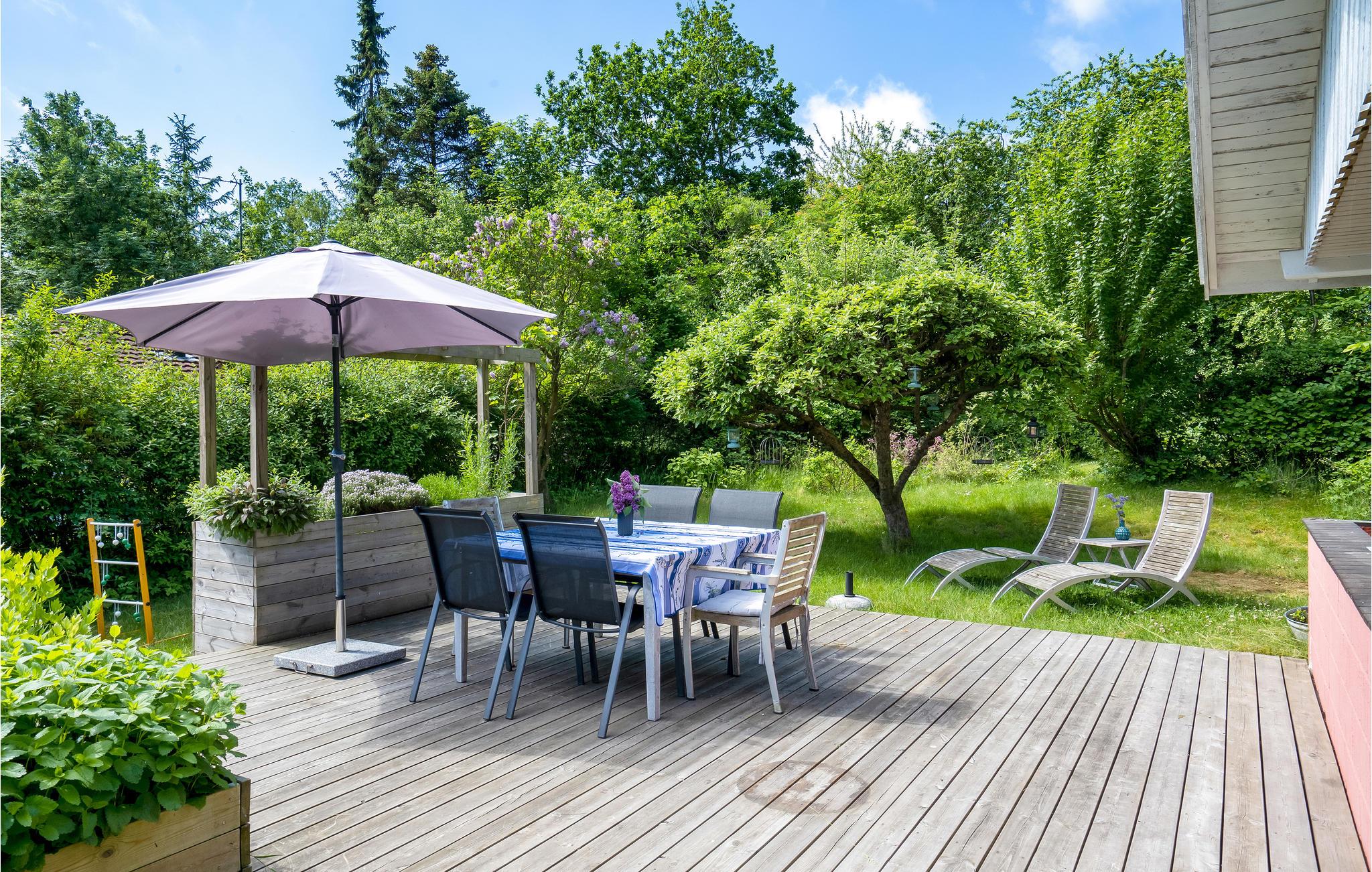 Grunden byder på mange hyggelige hjørner og terrasseområder, hvor I kan samles om en middag, eller man kan sætte sig for sig selv med en bog. Nyd solen på liggestolene, inviter familie og venner til en hyggelig grillaften eller lad børnene lege i haven.