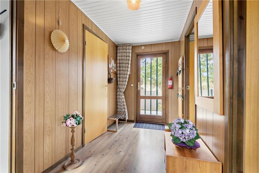 Både sommerhuset og det tilhørende udhus er opført med træfacade og grønt tag , så bygningerne passer fint ind i de naturskønne omgivelser. Hele dagen lang er det skønt at holde ferie så smukt et sted, for uanset om I laver morgenkaffe i køkkenet eller tilbringer aftenen i sofaafdelingen, kan I nyde udsigten til jeres egen grønne naturgrund. Opholdsrummet består af stue og integreret køkken, og netop køkkenet er en af de moderne forbedringer, som sommerhuset er blevet optimeret med. Også badeværelset fremstår særdeles pænt, og her er der på bekvem vis ikke bare bruseniche og WC, men også gulvvarme og vaskesøjle. På de tre soveværelser kan fem feriegæster i alt finde sig godt til rette, når I trænger til en god nats søvn efter dagens oplevelser.