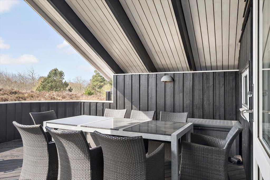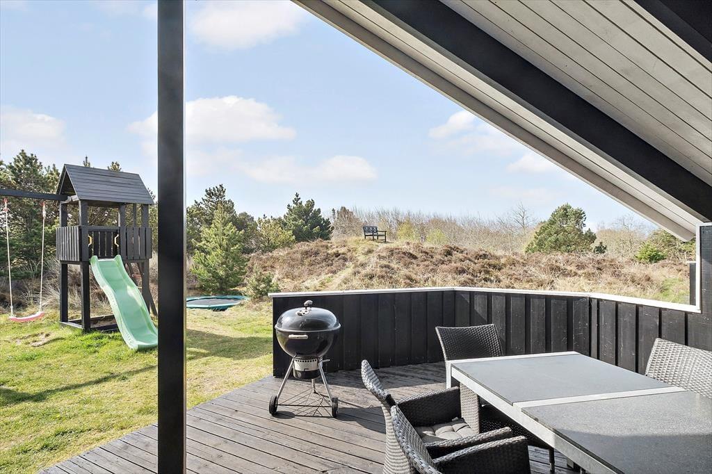 Husets hundevenlige faciliteter kan især ses ude i det fri, hvor en hundegård er placeret midt på den 2500 m2 store, kuperede naturgrund, og hvis I vil holde vovsen med selskab, kan I slå jer ned på den tilstødende vestvendte terrasse. Omkring sommerhuset er der desuden flere dejlige og delvist overdækkede terrasser at vælge imellem, og på toppen af en klit står der en bænk, hvorfra I kan skue ud over Bolilmarks smukke naturomgivelser. Til børnene er der sandkasse, trampolin og et legetårn med gynger, og de vandglade vil sætte pris på det lille badebassin og den udendørs bruser.