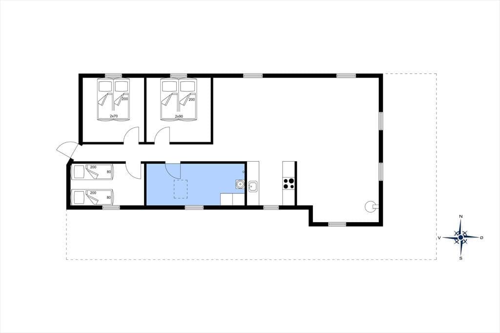 Sommerhuset kan bedst beskrives som en både funktionel og hyggelig feriebolig på 90 m2, der har en glimrende planløsning til seks overnattende gæster. Soveværelser er der tre af, hvoraf to er indrettet med dobbeltseng hvor det ene sæt er med elevationsseng og et med to enkeltsenge. På husets badeværelse er der ikke bare bruser, gulvvarme og vaskemaskine, men også spabad og sauna, så I kan se frem til wellnessaftner og total afslapning. Når I skal samles inden døre, kommer det formentlig til at foregå i sommerhusets stue, som ligger i åben forbindelse med et veludstyret køkken. Ligesom i resten af huset er atmosfæren lys og indbydende i opholdsrummet, og på charmerende vis er der loft til kip, brændeovn og store vinduespartier, der inviterer sollyset og de naturskønne omgivelser indenfor.