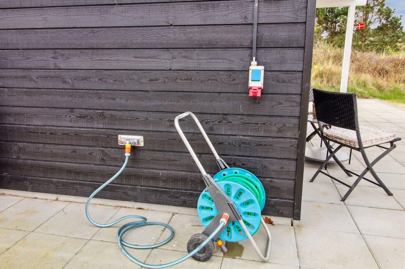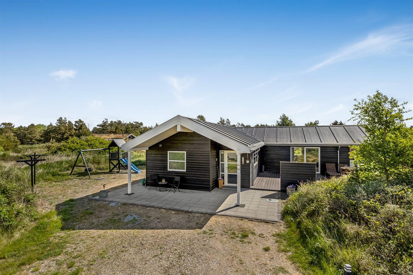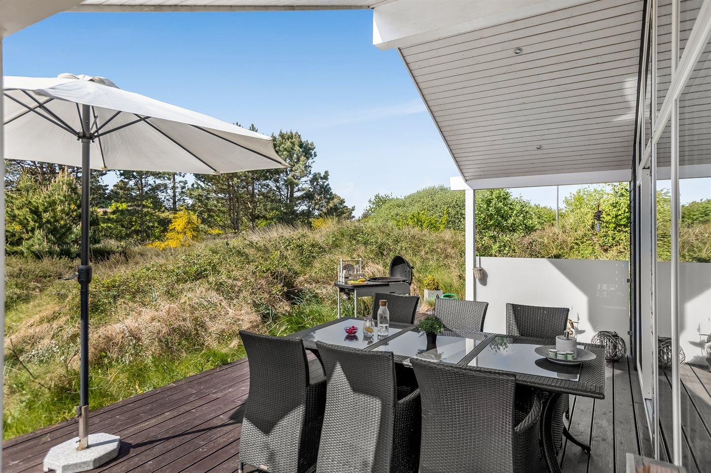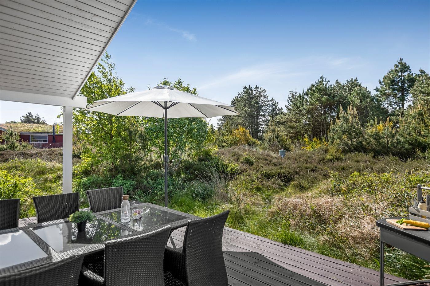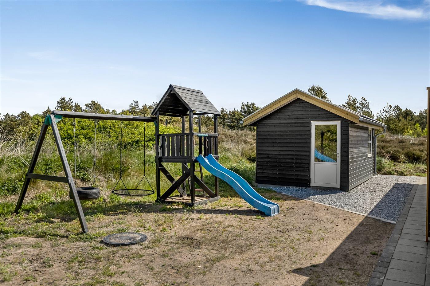 Ferieboligen er beliggende på en 2500 m² stor naturgrund. Der er 2200 m til havet. Der er 2600 m til Vadehavet. Nærmeste forretning er beliggende i en afstand af 1800 m. Der er en golfbane i en afstand af 8500 m. Til ferieboligen hører 70 m² terrasseareal. Desuden er der 14 m² overdækket terrasse. Der er redskabsrum. Gynge. Sandkasse. Grill til rådighed. Der er installeret stik til opladning af elbil. CEE stik. Med 11 kW ladeeffekt. Parkering ved ferieboligen.