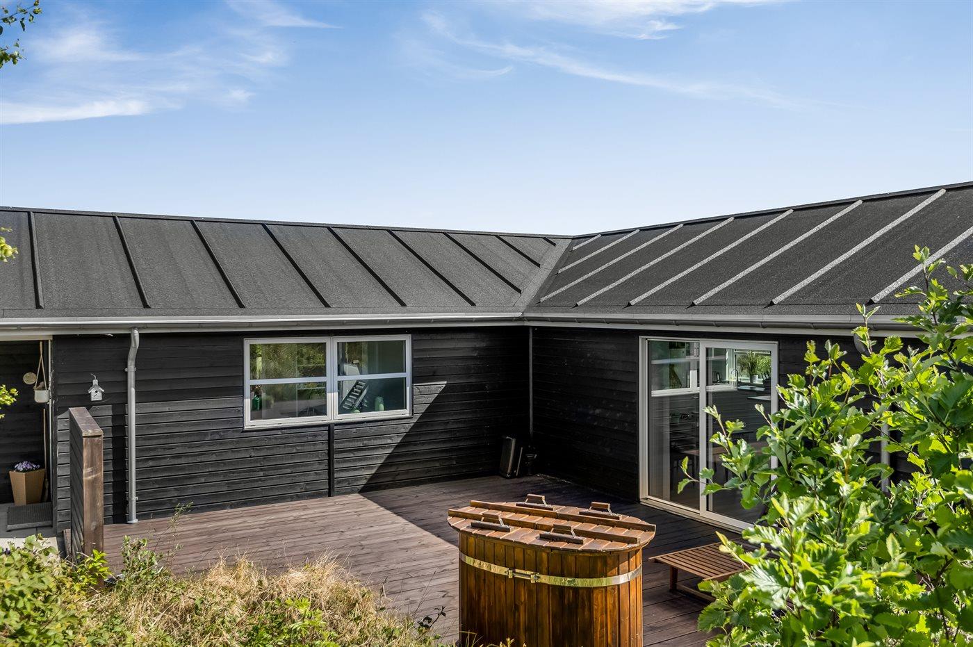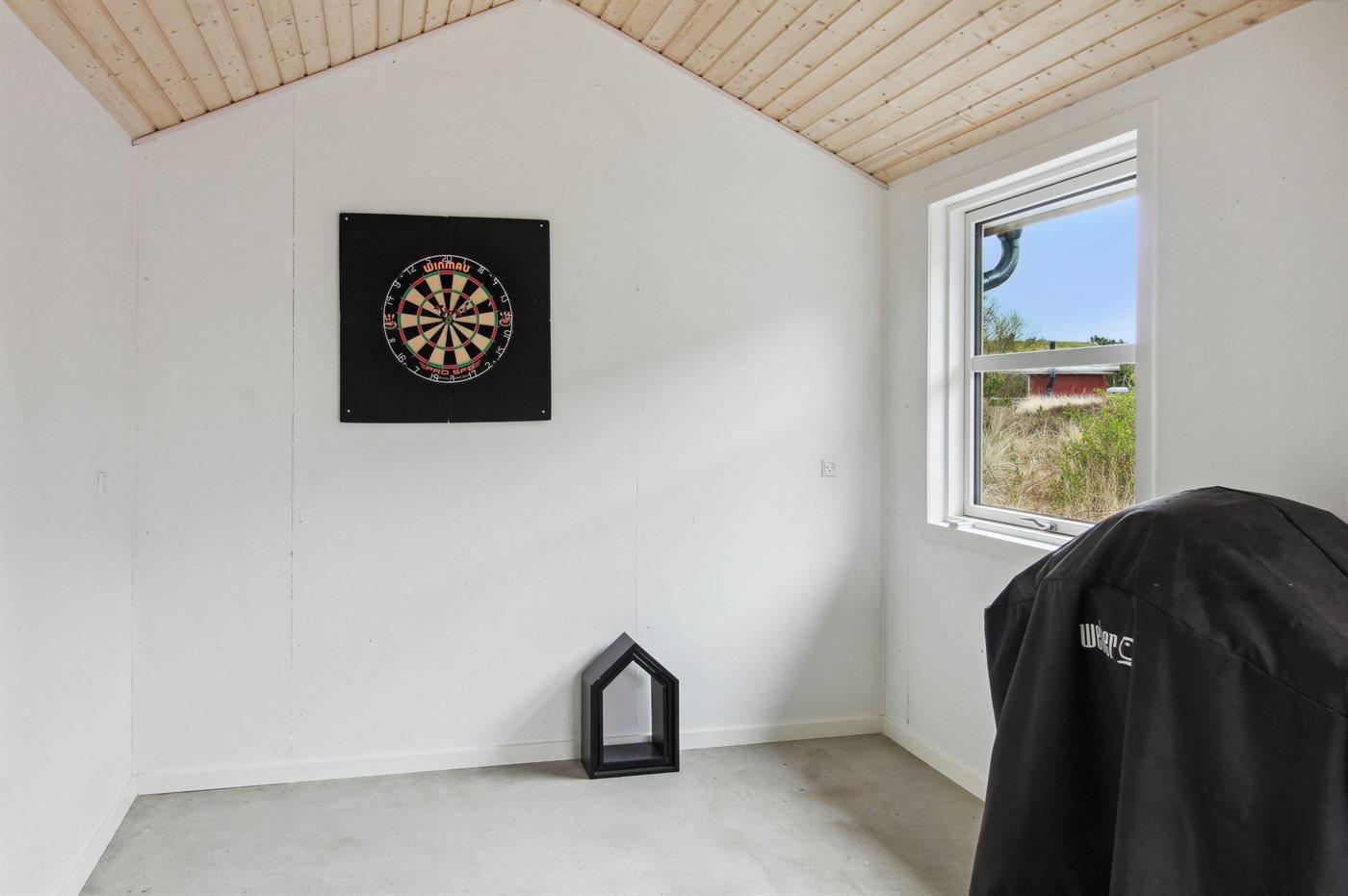 Et dejligt lyst og velindrettet sommerhus med bl.a. 2-pers. spa og gode værelser. Køkkenet og opholdsstuen ligger i åben forbindelse og herfra er der direkte adgang til den store og delvist overdækkede terrasse, hvor der står et koldt-/varmtvandskar. I redskabsrummet er der sat et dartspil op.
