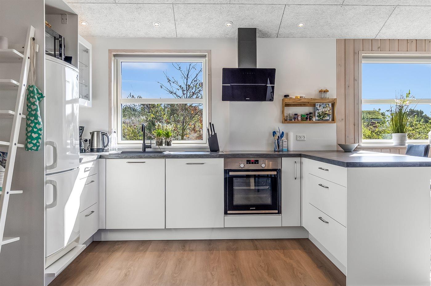 Køkkenet er udstyret med 1 køleskab. Der er 4 keramiske kogeplader, varmluftovn, mikrobølgeovn samt opvaskemaskine.