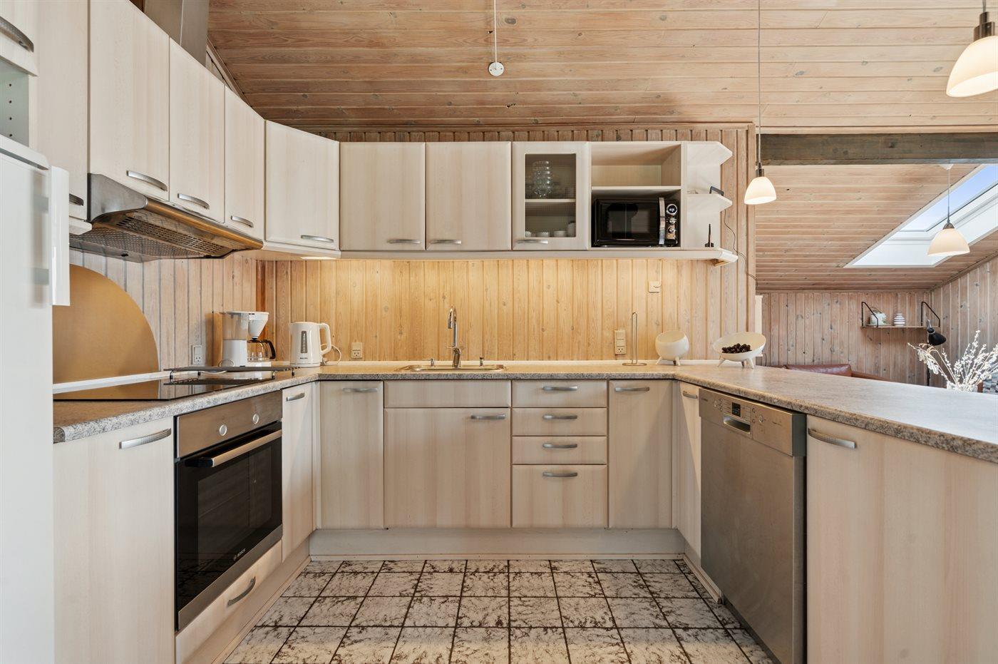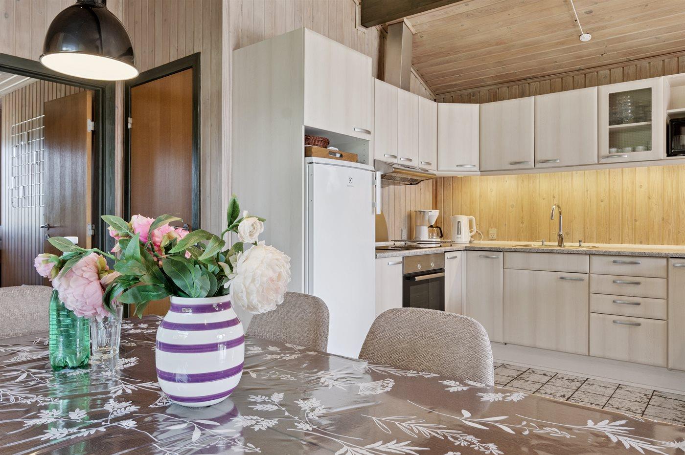 Køkkenet er udstyret med 1 køleskab. Der er 4 elkogeplader, bageovn, mikrobølgeovn samt opvaskemaskine.
