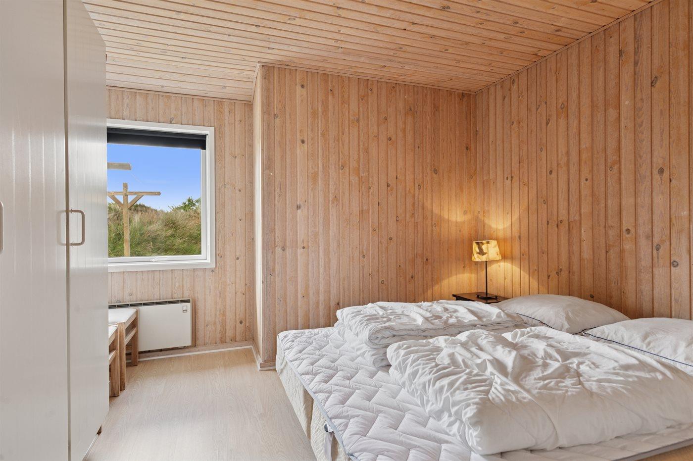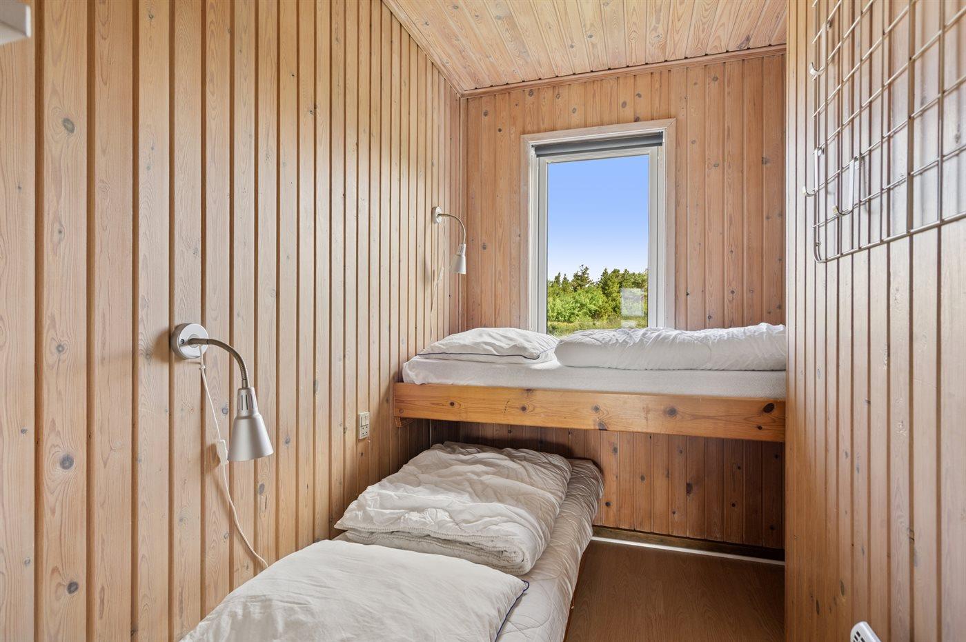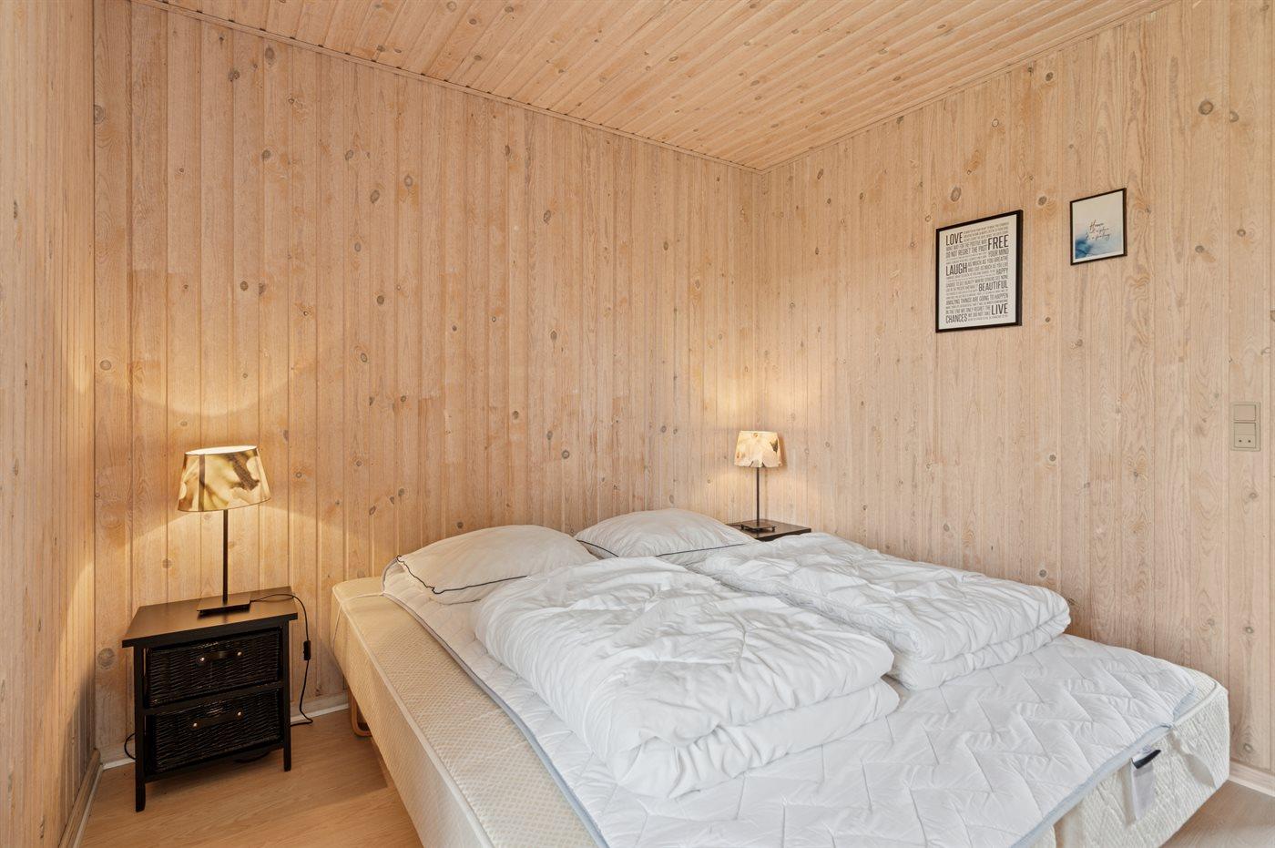 Der er i alt 4 soveværelser. Sovepladserne fordeler sig på: 6 sovepladser i dobbeltsenge. 1 soveplads i enkeltseng.1 soveplads i køjeseng. Derudover er der 1 stk. barneseng.