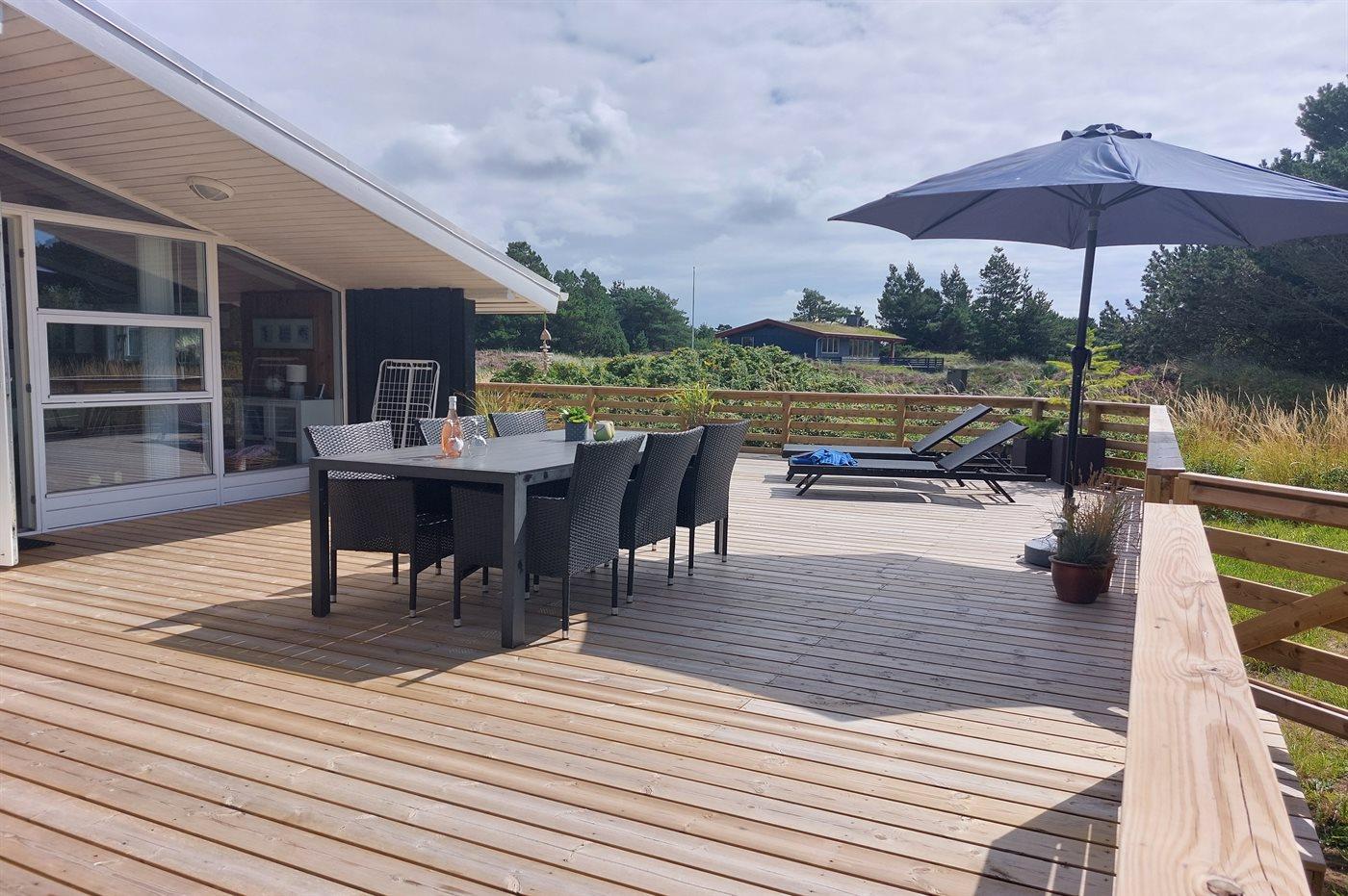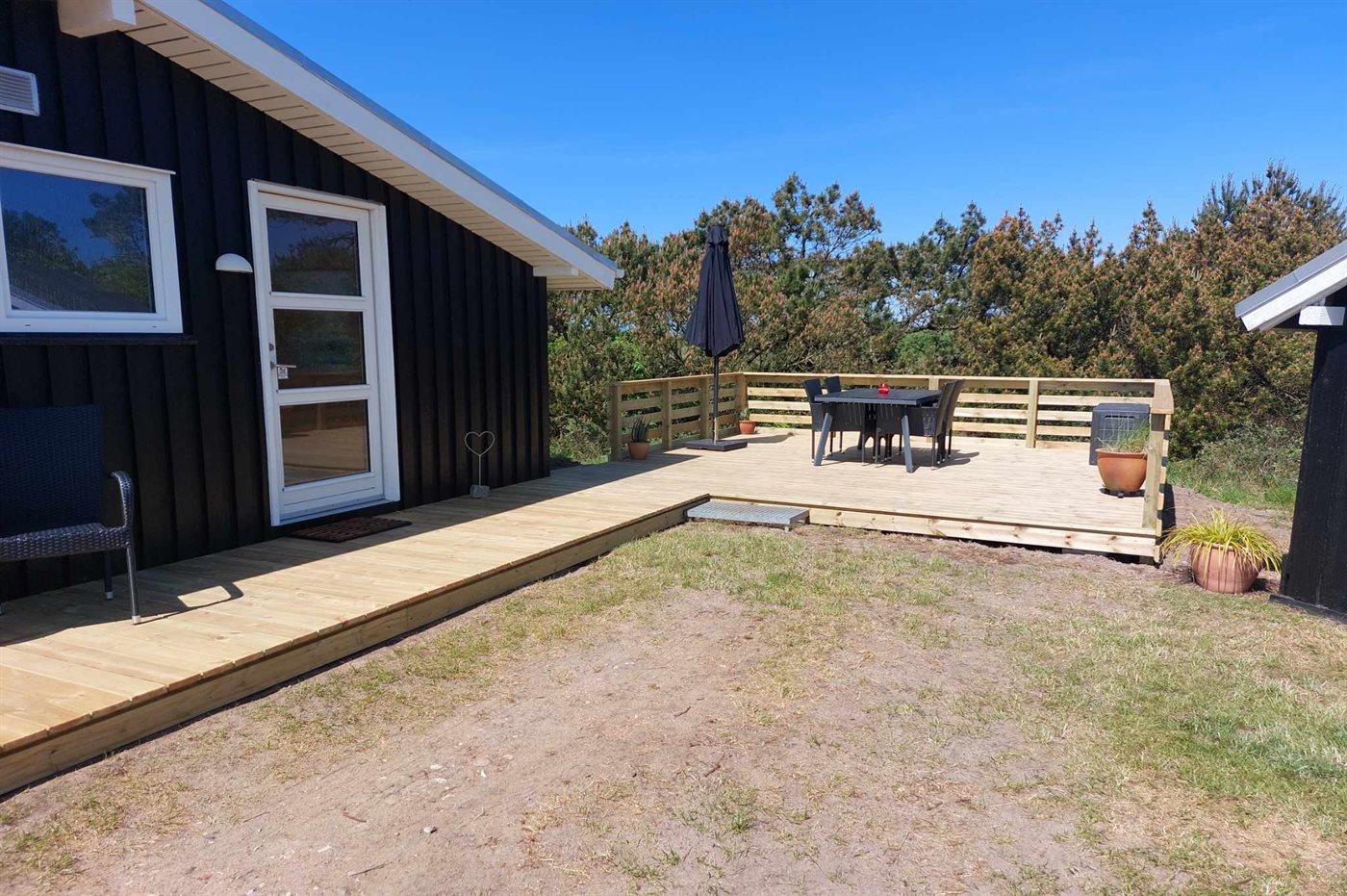 På en særdeles skøn naturgrund, på en rolig vej i Bolilmark ligger dette dejlige sommerhus Til huset hører en stor såvel åben som overdækket, vestvendt terrasse med havemøbler. Terrassen er godt afskærmet og perfekt til både solbadning og mange dejlige grillaftener. Huset er desuden blevet ombygget og har fået tilføjet en flot glasfacade som giver et helt unikt og afstemt indeklima. Et hus som danner de perfekte rammer for en god ferie midt i naturen og tæt ved en af Europas absolut bedste badestrande, hvortil der er direkte adgang fra den nærliggende cykel- og vandresti.