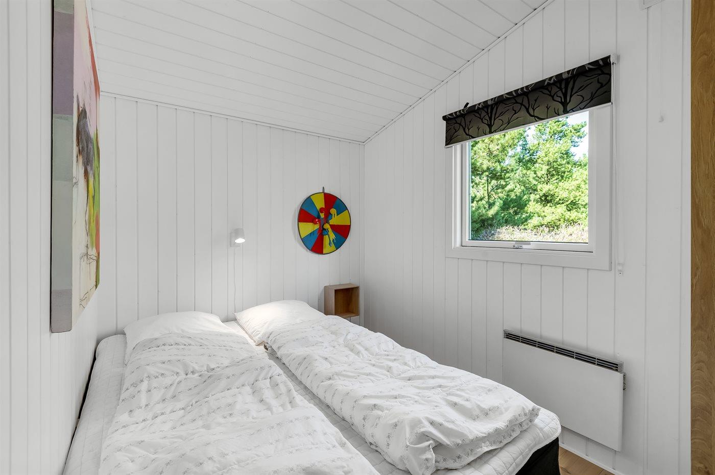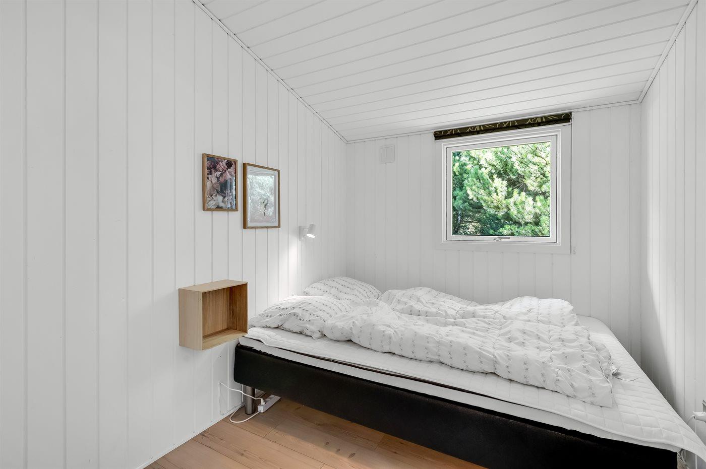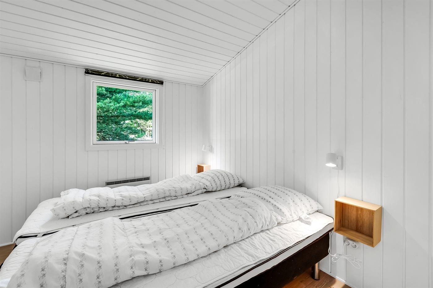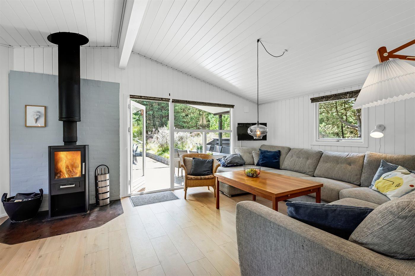 Til huset hører en stor, delvist overdækket terrasse med havemøbler og Weber-grill. Lyst badeværelse med 2-pers. spa, bruser, gulvvarme og direkte adgang til husets sauna. Gæstetoilet med vaskemaskine og tørretumbler. Køkkenet ligger i forbindelse med stuen og indeholder bl.a. fryser, opvaskemaskine, mikrobølgeovn, varmluftovn og komfur med keramiske kogeplader. I opholdsstuen er der brændeovn og TV. Sovepladserne er fordelt på 4 lyse soveværelser; 2 med dobbeltseng og 2 med hver 2 enkeltsenge.