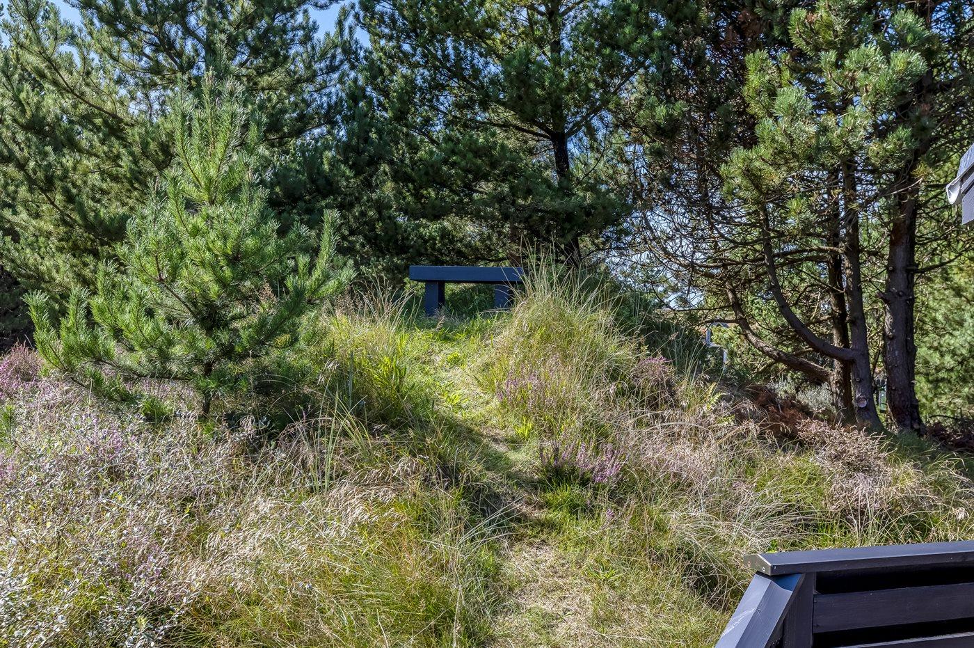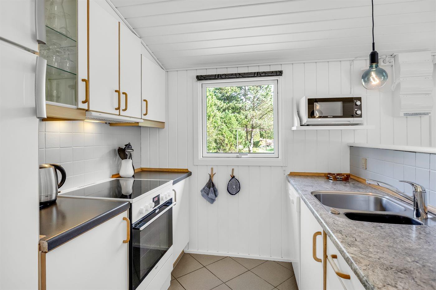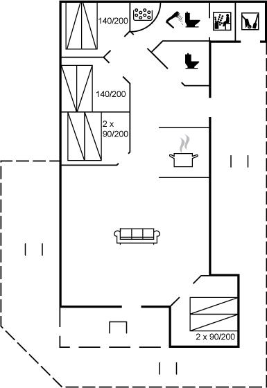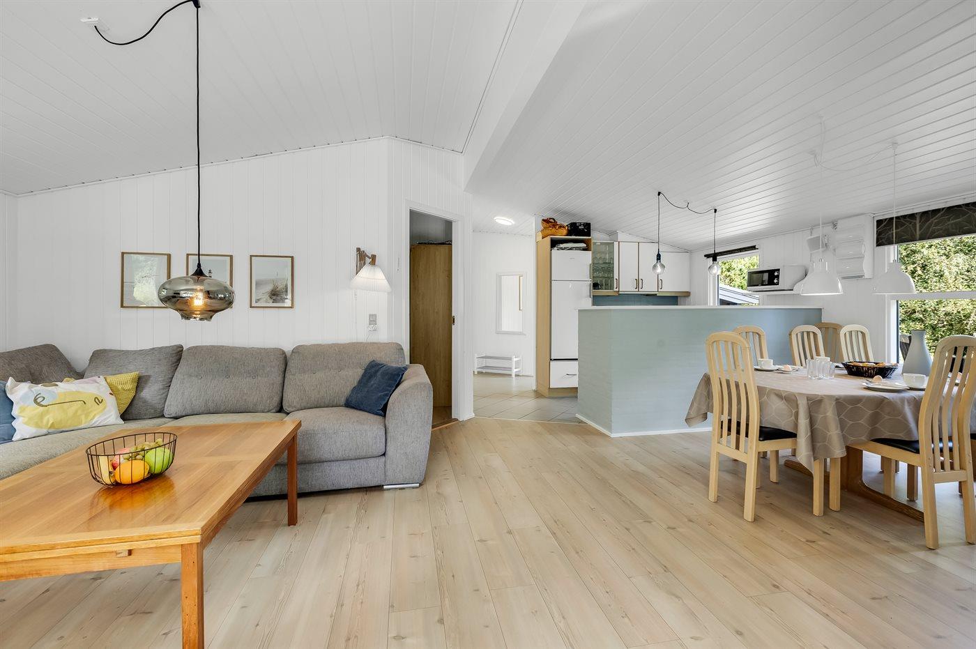 Til huset hører en stor, delvist overdækket terrasse med havemøbler og Weber-grill. Lyst badeværelse med 2-pers. spa, bruser, gulvvarme og direkte adgang til husets sauna. Gæstetoilet med vaskemaskine og tørretumbler. Køkkenet ligger i forbindelse med stuen og indeholder bl.a. fryser, opvaskemaskine, mikrobølgeovn, varmluftovn og komfur med keramiske kogeplader. I opholdsstuen er der brændeovn og TV. Sovepladserne er fordelt på 4 lyse soveværelser; 2 med dobbeltseng og 2 med hver 2 enkeltsenge.