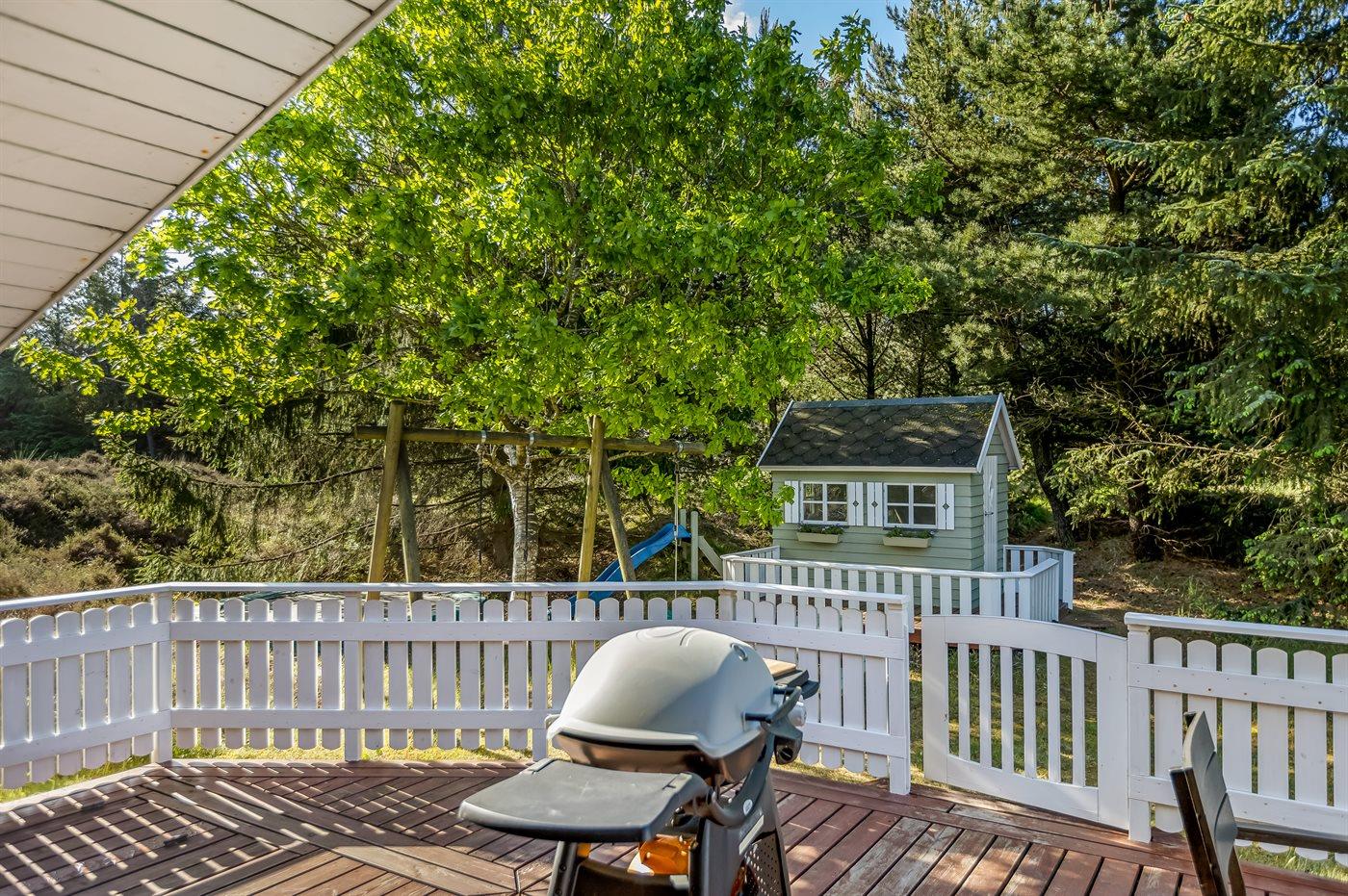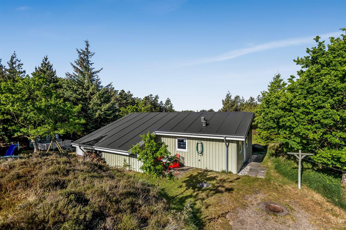 Ferieboligen er beliggende på en 2879 m² stor naturgrund. Der er 2200 m til havet. Nærmeste forretning er beliggende i en afstand af 4100 m. Til ferieboligen hører 16 m² terrasseareal. Desuden er der 9 m² overdækket terrasse. Heraf i alt 20 m² lukket terrasse. Gynge. Sandkasse. Legehus. Trampolin. Parkering ved ferieboligen.