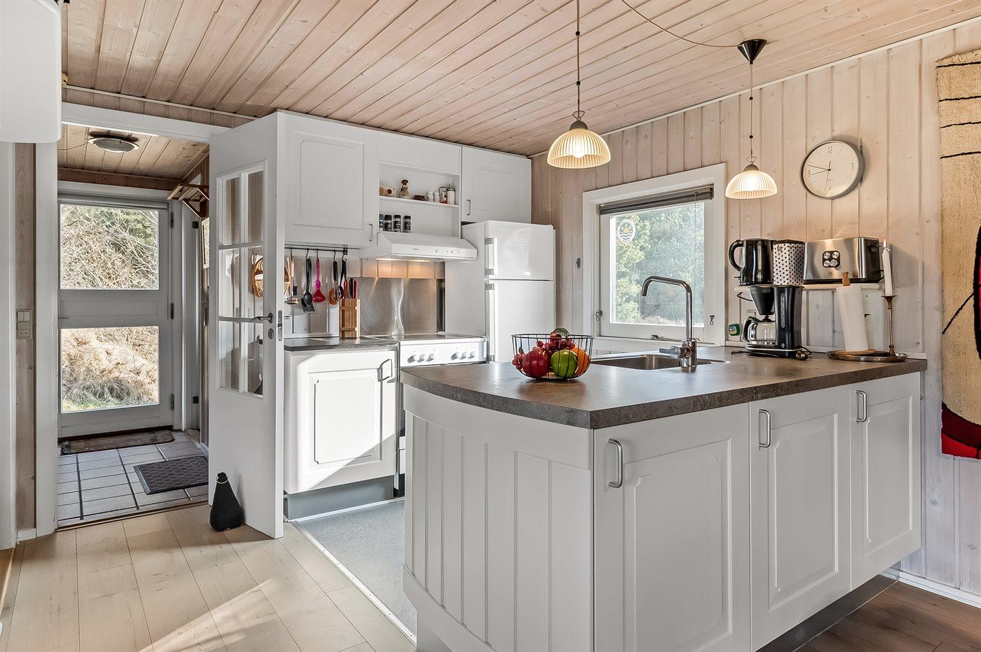 Køkkenet er udstyret med 1 køleskab. Der er 4 keramiske kogeplader, varmluftovn, mikrobølgeovn samt opvaskemaskine.