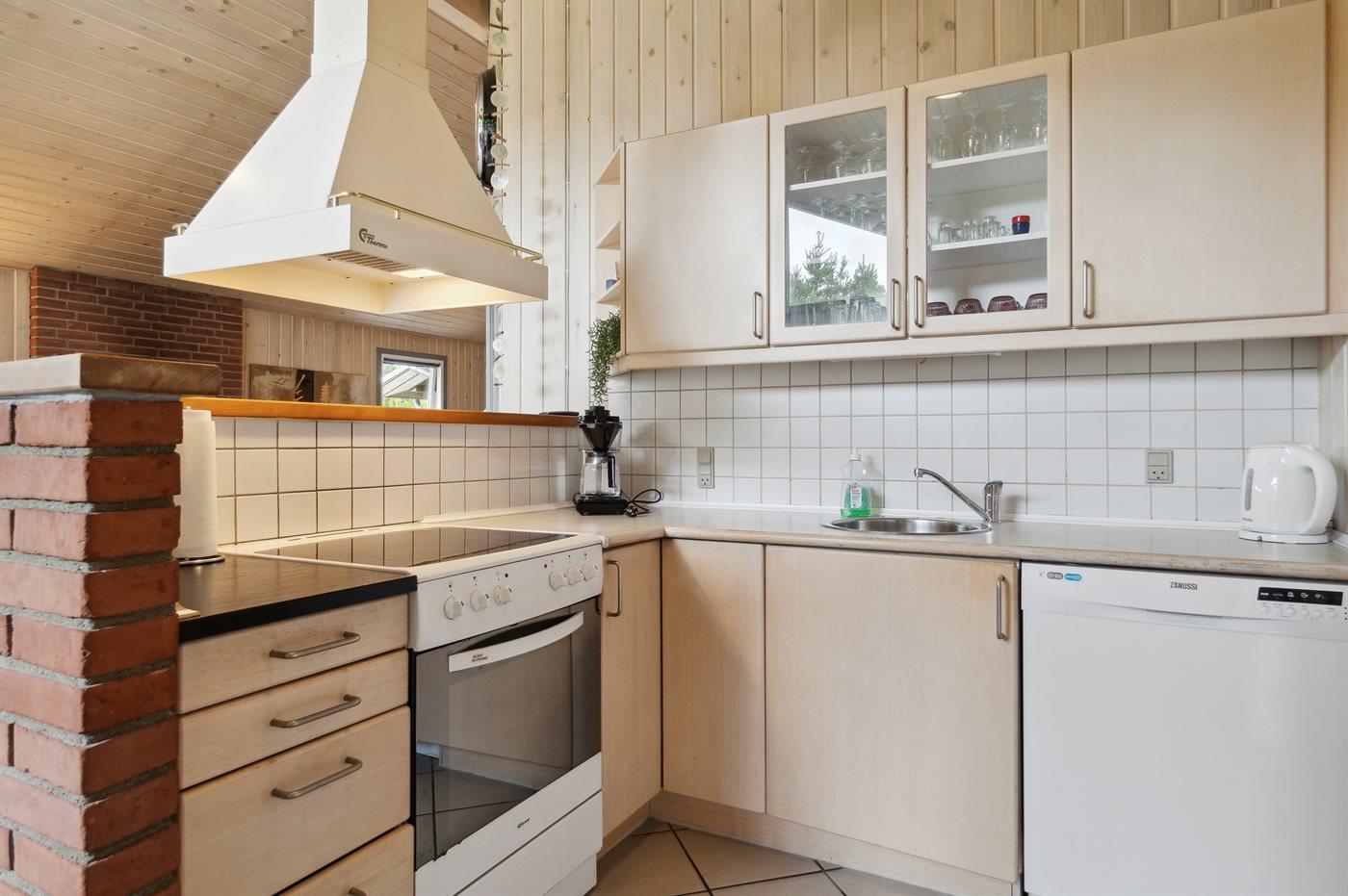 Køkkenet er udstyret med 1 køleskab. Der er 4 elkogeplader, bageovn, mikrobølgeovn samt opvaskemaskine.