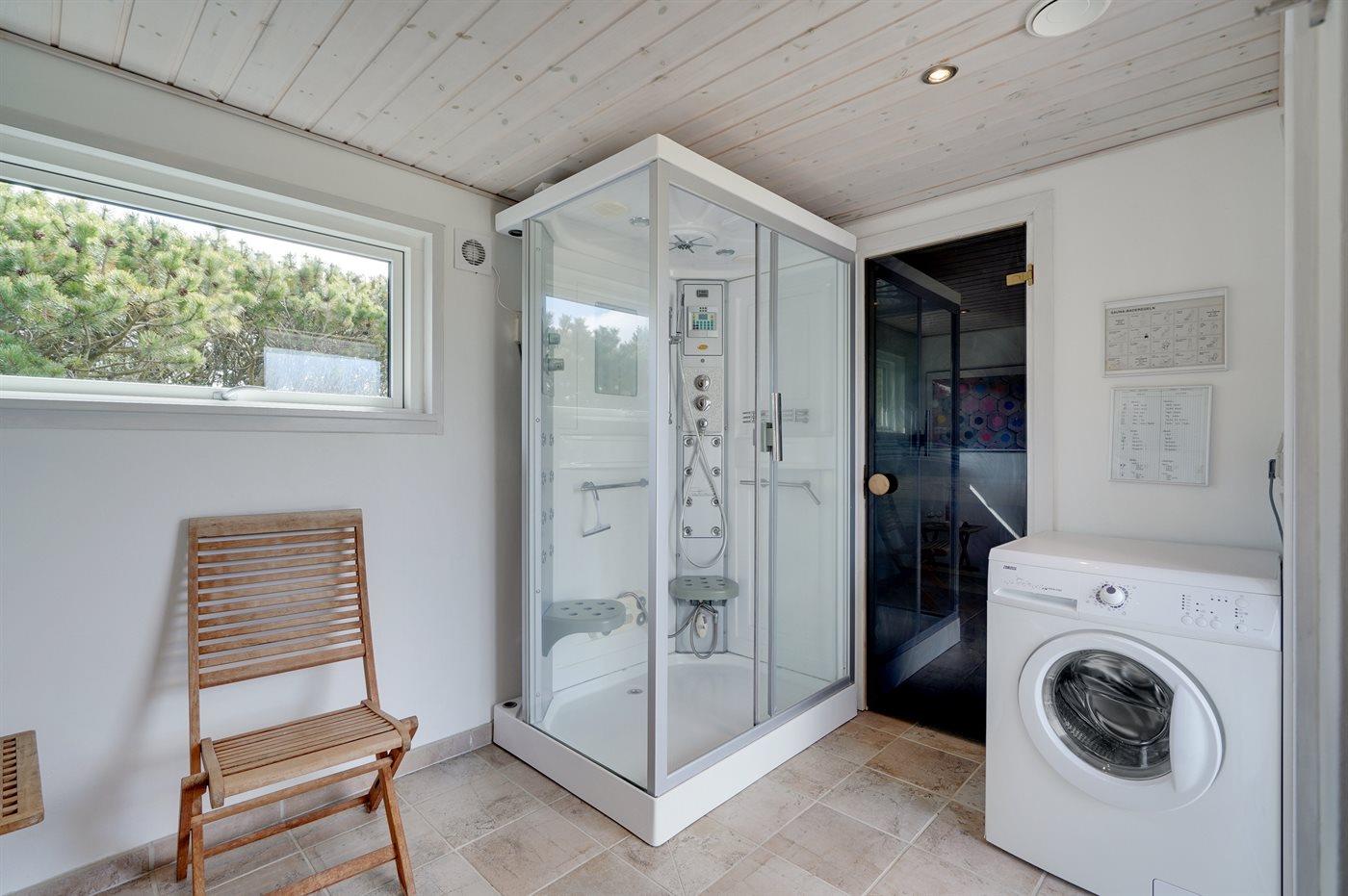 Der er 2 badeværelser med bruseniche og 2 toiletter. Der er gulvvarme på 1 badeværelse. I saunaen er der mulighed for afslapning.