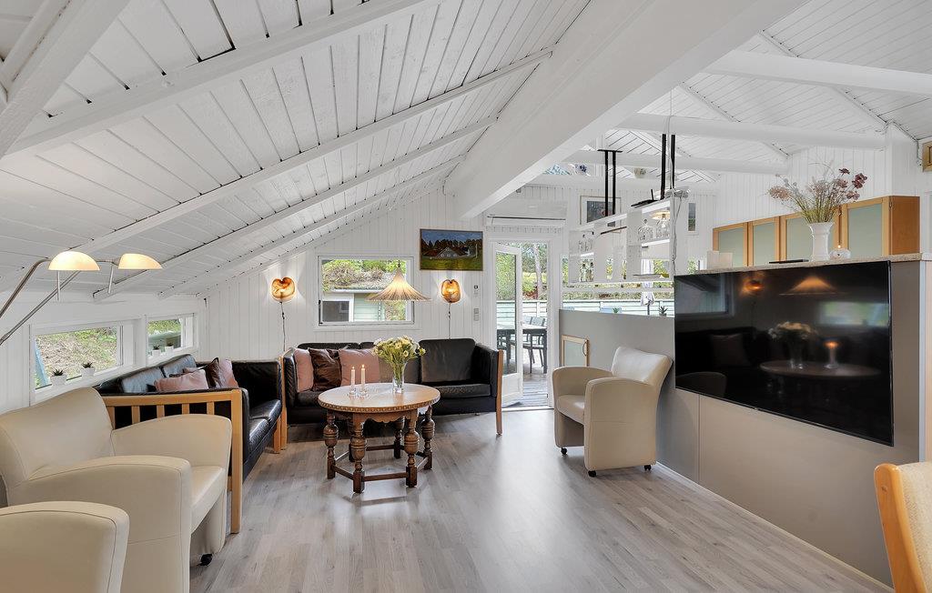 Velkommen i dette rummelige, moderne og veludstyrede sommerhus, som ligger på en dejlig naturgrund, omgivet af træer. Her er gæsternes velvære i centrum, så I kan se frem til et skønt ophold sammen. Sæt jer til rette og slap af i leddene i saunaen eller i den hjerteformede spa, hvilket også gør huset velegnet til romantiske parferier. Den hyggelige stue giver jer gode rammer om måltiderne, og det samme gør terrassen, som bliver jeres foretrukne opholdssted i sommermånederne; på køligere aftener står en terrassevarmer til rådighed. Her er der både sol og skygge i middagstimerne, så find et godt hjørne og sæt jer med en kop kaffe, mens børnene og jeres hund boltrer sig i haven. Både ude og inde er der gode muligheder for leg og underholdning, bl.a. forskellige spil, playstation 3 og Wii, legehus og sandkasser, så de yngre gæster ikke kommer til at kede sig. Glæd jer til hyggelige grillaftener med farverige solnedgange i baggrunden.
