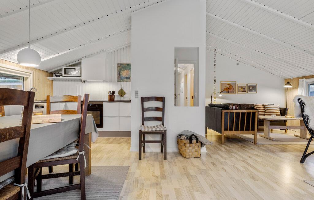 På en flot, kuperet naturgrund ligger dette rummelige træsommerhus. I huset er der en praktisk og veludstyret køkkenafdeling, der ligger i åben forbindelse med den lyse, kombinerede opholds-/spisestue. Stuen er udstyret med moderne møbler samt en hyggespredende brændeovn. Fra den hyggelige stue er der udgang til en skøn, ugenert vestvendt terrasse. Husene i Bolilmark har græstørv på taget, så de falder pænt i med områdets flotte natur - i gåafstand fra huset fører en cykelsti til Lakolk og Nordeuropas bredeste sandstrand.