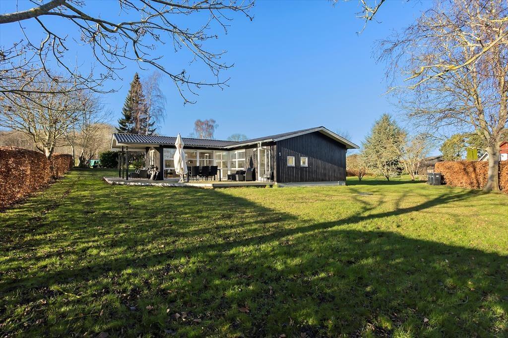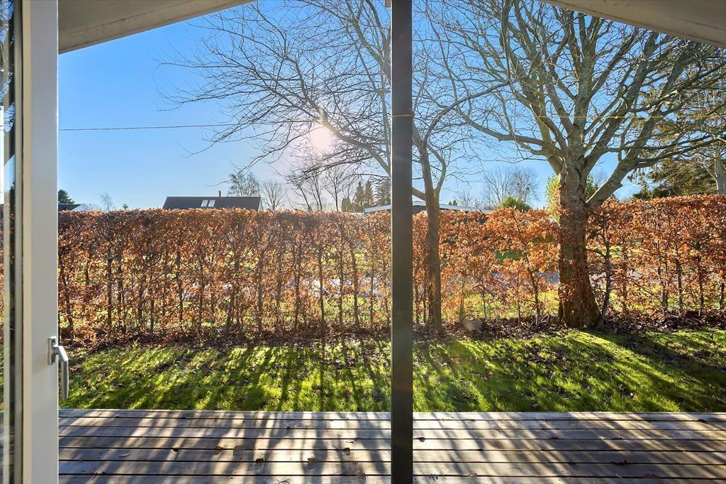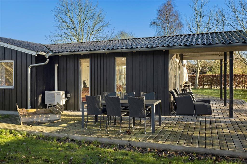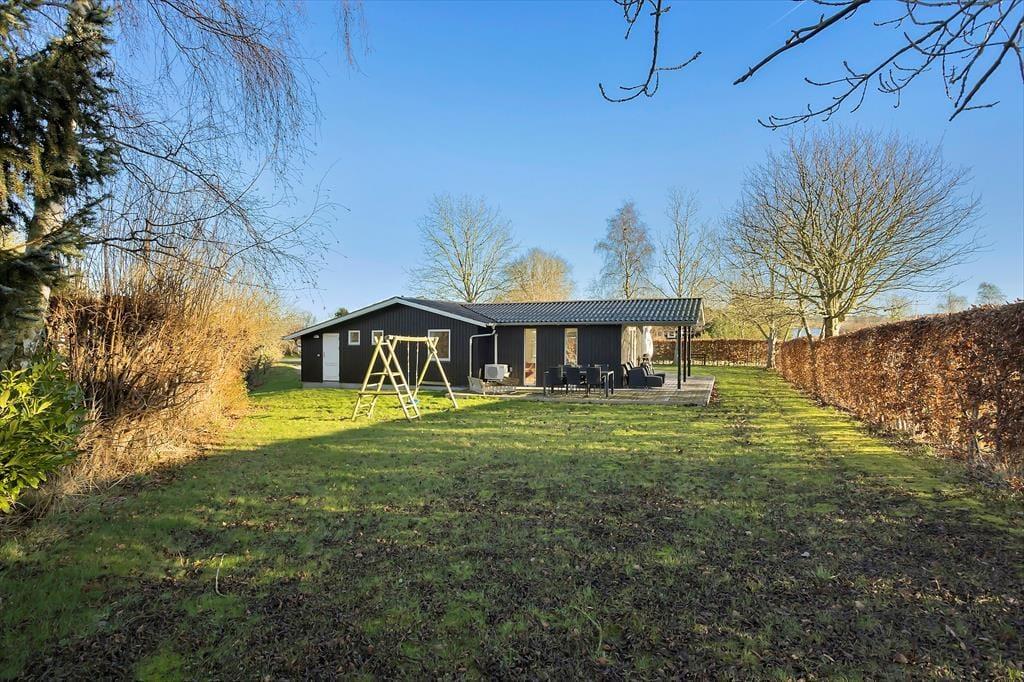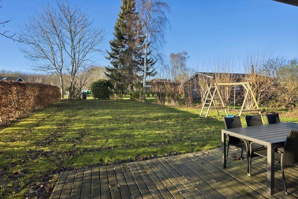 Udenfor finder du en stor træterrasse med flere spisepladser, hvor du kan nyde dine måltider i den friske luft. Terrassen er det perfekte sted til at starte dagen med en kop kaffe eller afslutte aftenen med et glas vin, mens solen går ned. Haven er ideel for børnefamilier, da den store græsplæne har masser af plads til leg og spil. Børnene vil elske gyngestativet, hvor de kan bruge timevis på sjov og aktiviteter. På terrassen kan du også tænde op i grillen og nyde et lækkert måltid tilberedt under åben himmel.