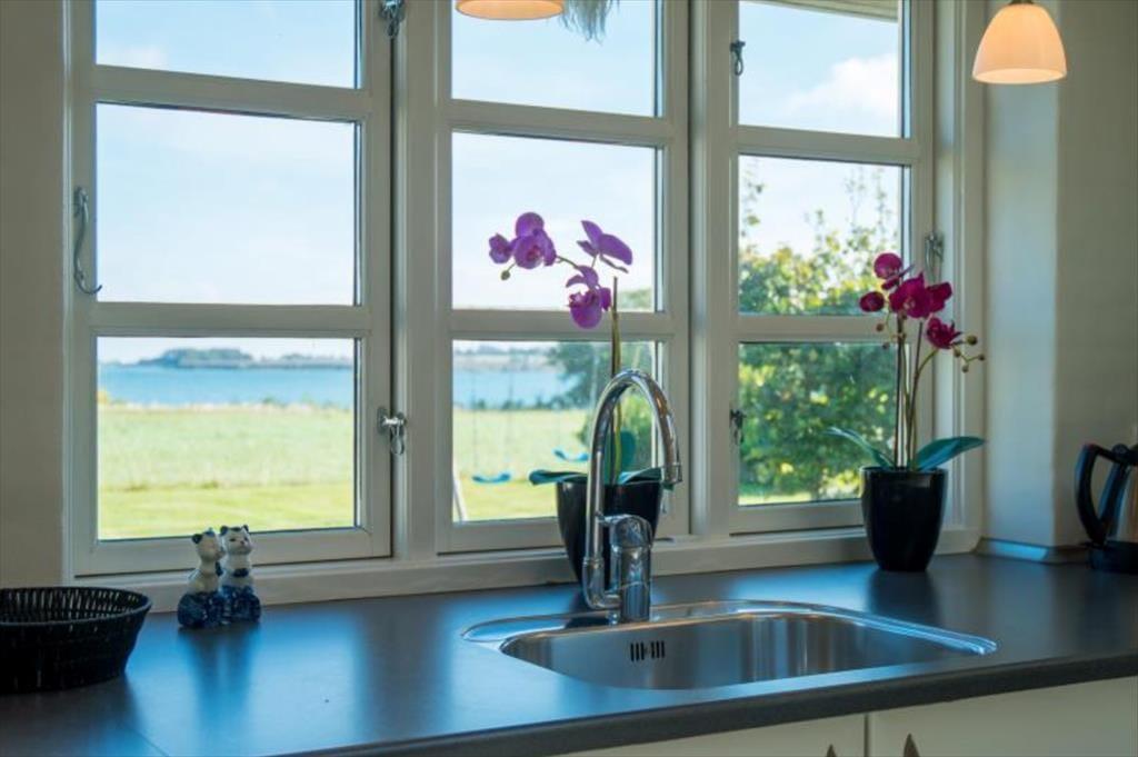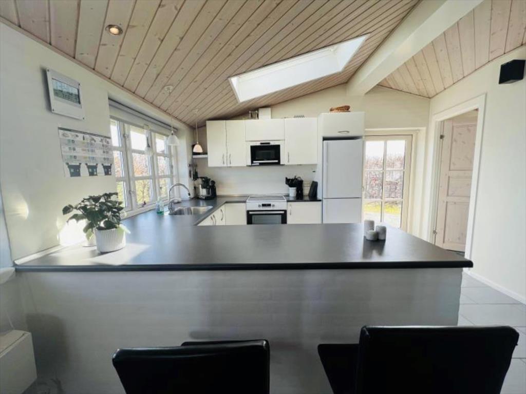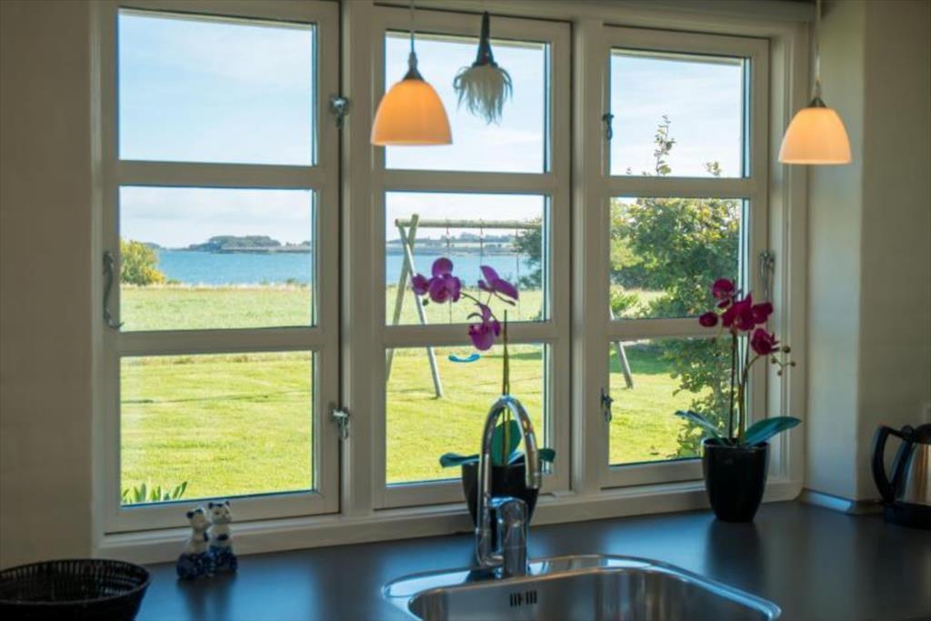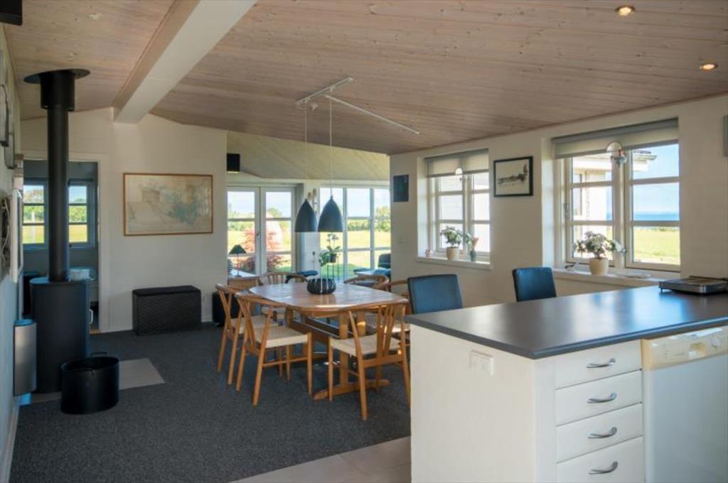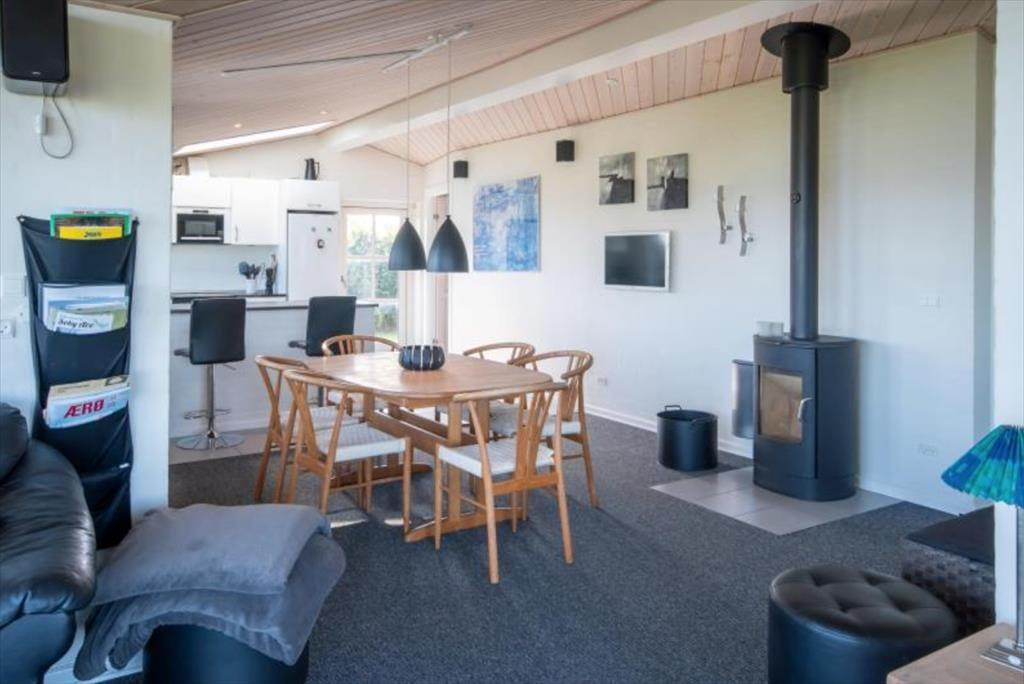 Huset er smagfuldt indrettet. Kombineret køkken-, spise- opholdsstue med brændeovn og den formidable udsigt over havet.