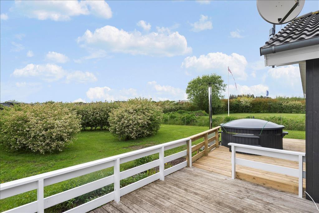 Haven er et skønt sted at tilbringe solskinstimerne, ikke mindst på den store træterrasse, der breder sig om tre sider af sommerhuset. En del af terrassen er overdækket, så selvom duggen falder, kan I sagtens blive siddende ude og nyde den lyse sommeraften. Leg og boldspil kan foregå på græsplænen, som også byder på en sandkasse og et gyngestativ til de alleryngste legebørn.