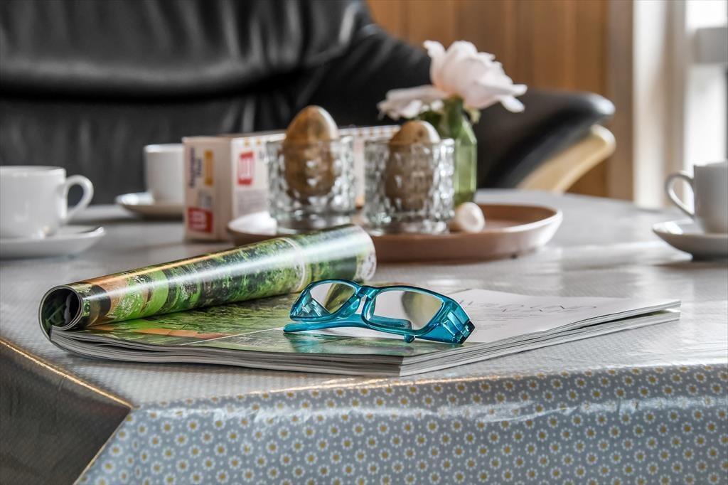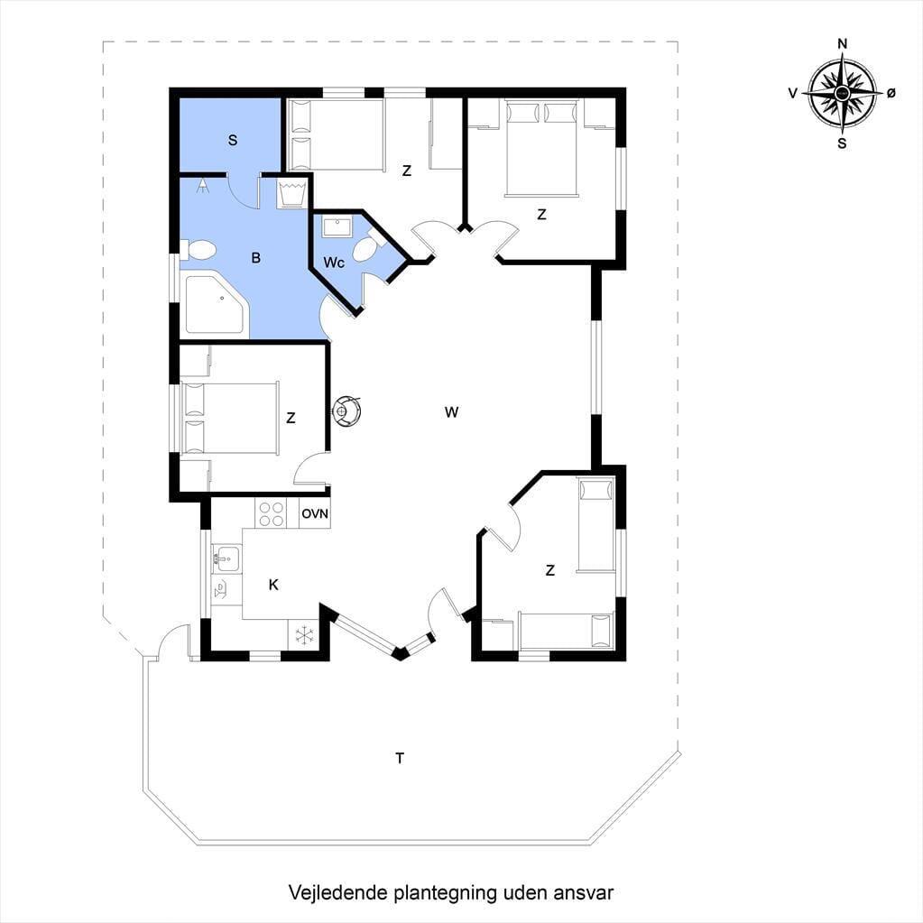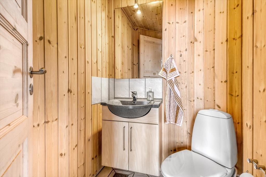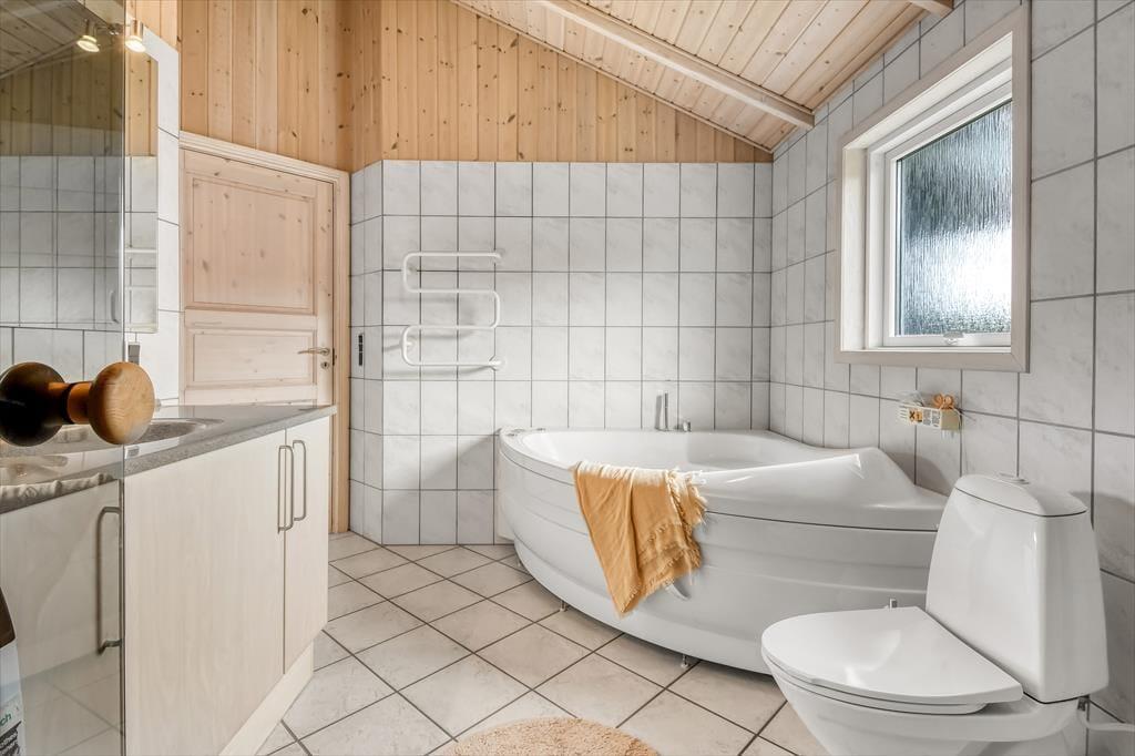 Hele vejen rundt om sommerhuset er der flisebelægning, så I kan finde havestolene frem og finde en dejlig krog med læ og sol uanset tidspunktet på dagen. Det er nu også oplagt at slå sig ned på selve terrassen, som er sydvendt og derudover delvist overdækket og afskærmet. Græsplænen indbyder til leg og boldspil, og i indkørslen kan der nemt stå flere biler, hvis I holder ferie flere familier sammen.