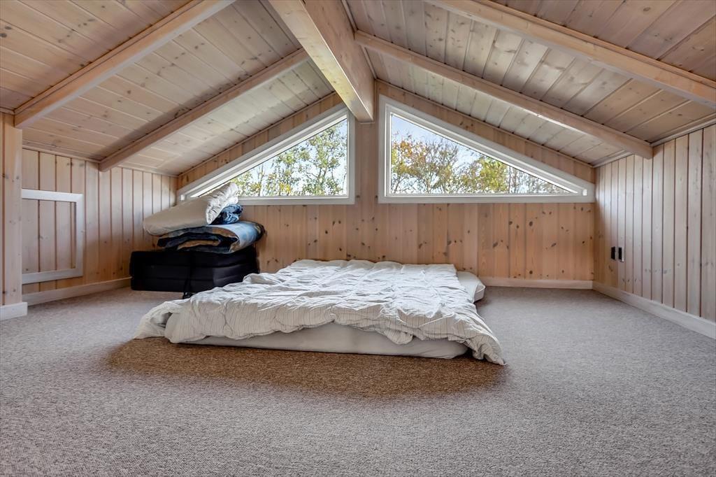 Inden døre kan I brede jer på hele 105 m², som blandt andet er fordelt på fire gode soveværelser, et gæstetoilet og et stort badeværelse med spa og sauna. Alle rum har direkte udgang til stuen, som er et stort og skønt opholdsrum med loft til kip, lyse trælister på væggene, store vinduespartier, brændeovn og åben køkkenafdeling. Med sådan en optimal planløsning har I god plads til at samles til gode måltider og sofaafslapning, og I kan også sagtens finde en rolig krog, hvor I kan hygge jer hver for sig med at læse bøger, lege og løse krydsogtværs.