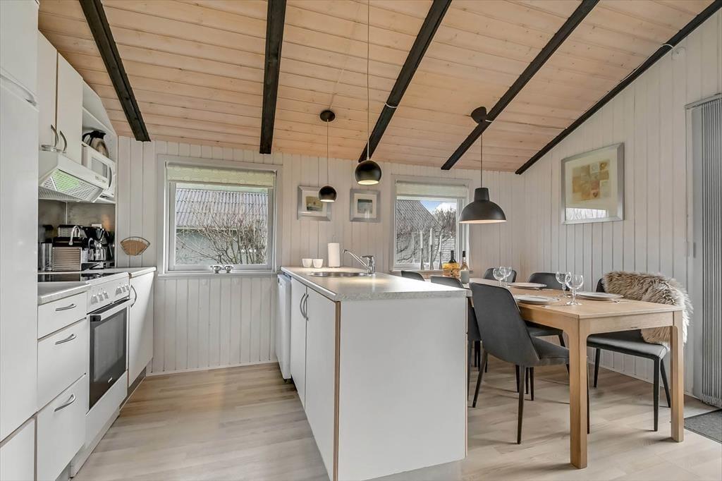 Alle rum i sommerhuset er hyggeligt indrettet, og også annekset er fuld af charme. Alligevel er det sandsynligvis i sommerhusets stue, at I vil samles, for det er nemlig et dejligt opholdsrum med spisebord, TV og en komfortabel sofaafdeling. En velindrettet køkkenafdeling er også del af rummet, så selv når I står med aftensmaden, kan I tage del i feriehyggen. Fra sommerhusets gang har I direkte adgang til et bryggers med vaskemaskine og tørretumbler, et badeværelse og to soveværelser med i alt fire sengepladser. Dertil kommer anneksets dobbeltseng, så det betyder, at i alt seks personer kan samles her i ferieoasen.