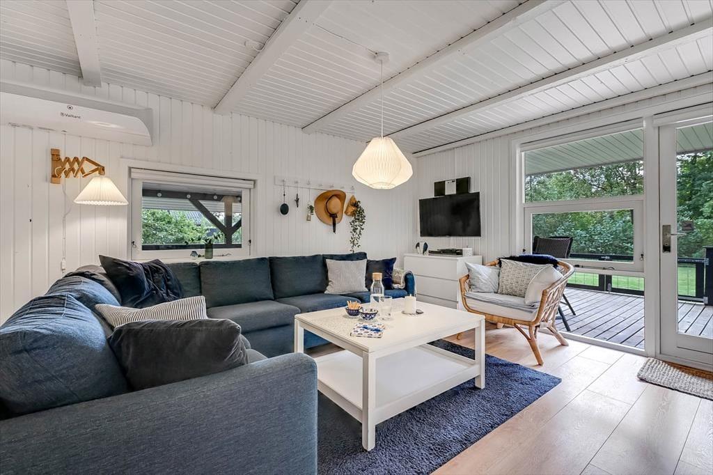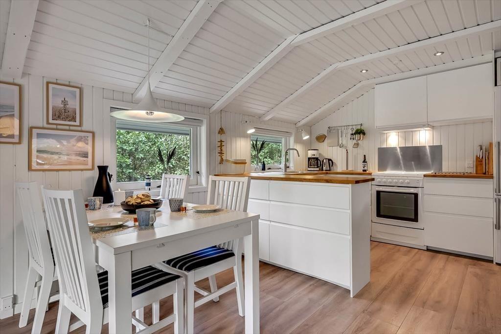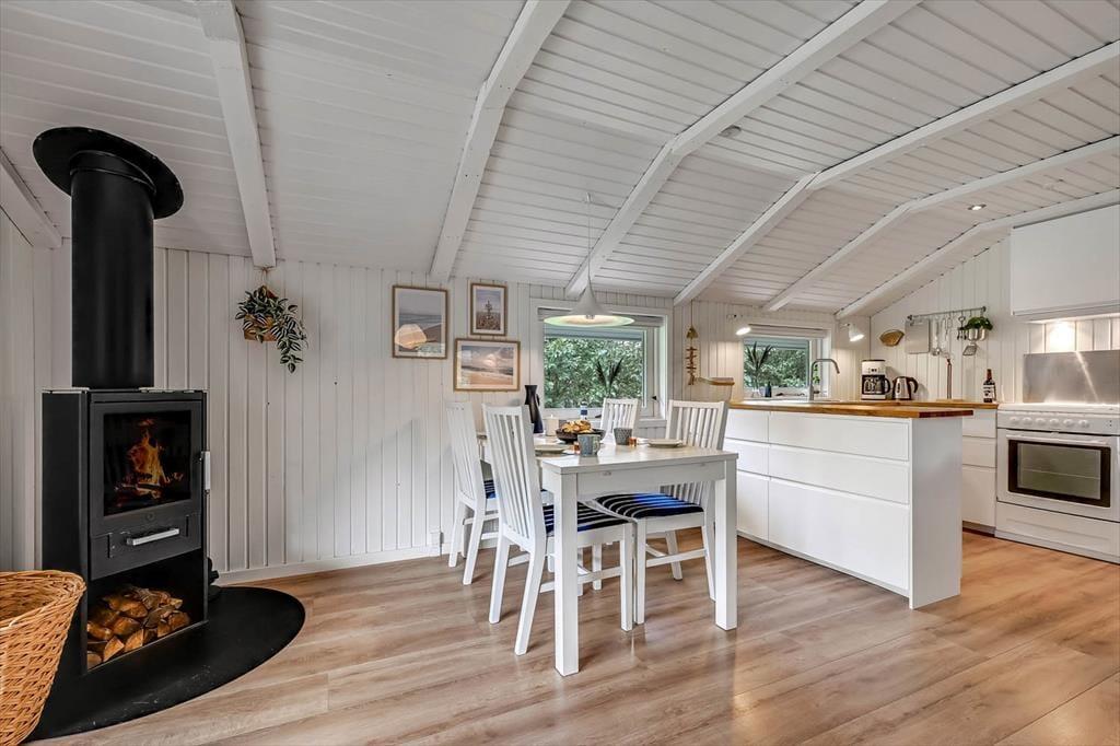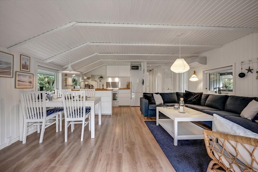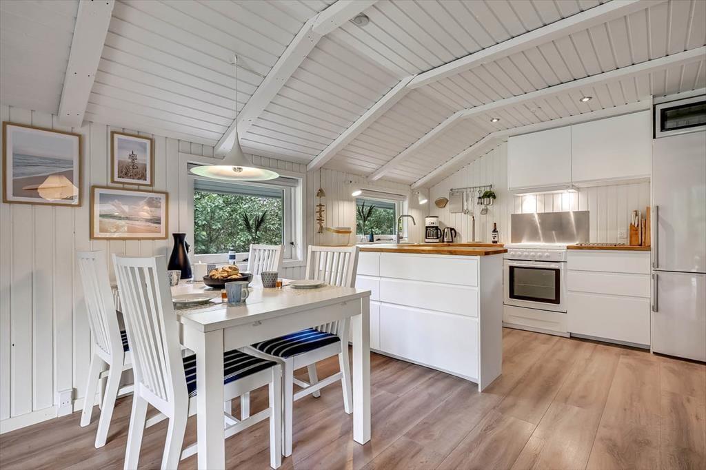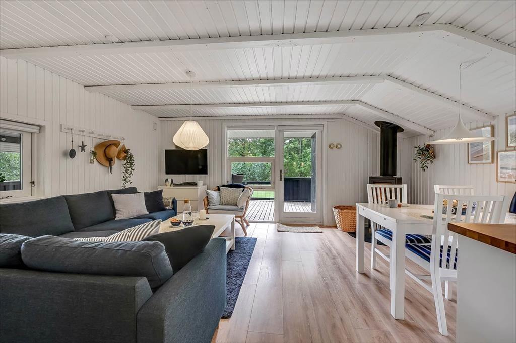 Set udefra er sommerhuset et ganske klassisk træsommerhus, som har stået her i haven siden 1988. Inden døre er en del af husets typiske sommerhustræk fint bevaret – men man kan nu også tydeligt se, at de lyse rum er blevet moderniseret på vellykket vis. Renoveringen foregik i 2018, hvor blandt andet både køkken og bad blev frisket op med stilrent interiør og gode hvidevarer. Det flotte køkken ligger i åben forbindelse med stuen, som er et stemningsfuldt opholdsrum med brændeovn, spisebord og en dejlig sofaafdeling, der indbyder til hygge og afslapning. De hvidmalede trælister på vægge og lofter er ikke kun et charmetræk ved stuen, men bidrager også til den rare stemning på de tre soveværelser, der i alt kan huse seks feriegæster.