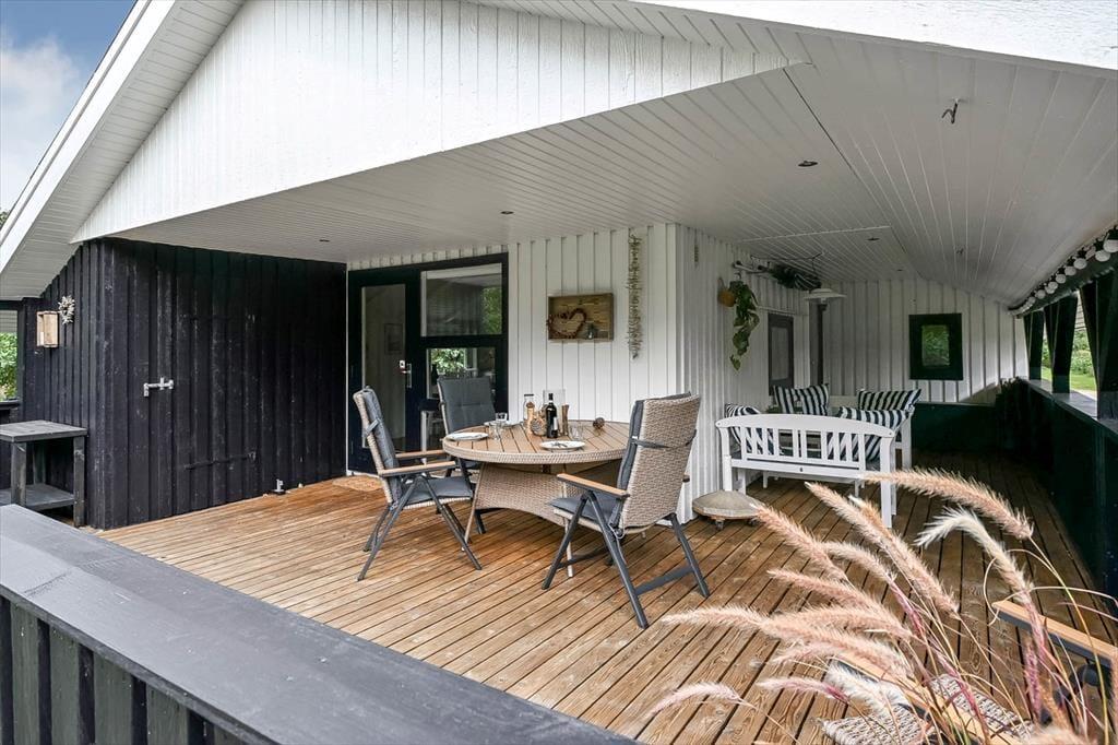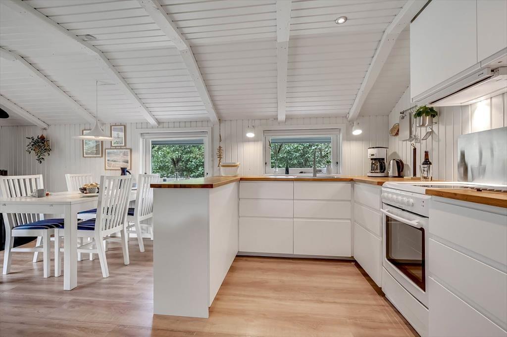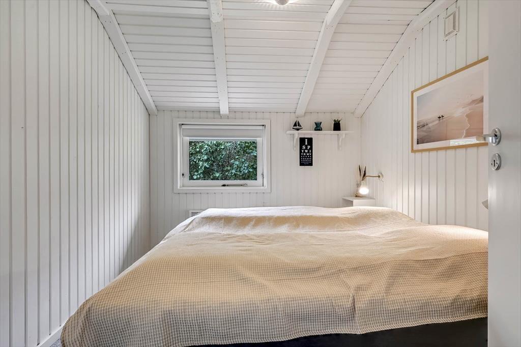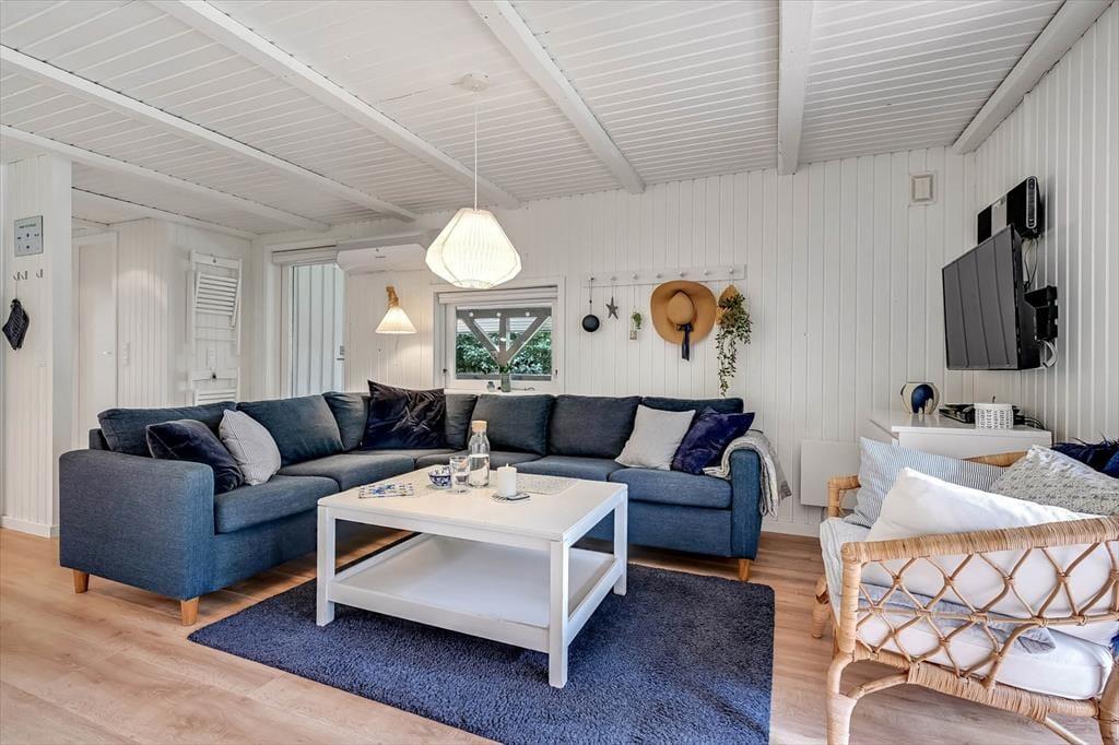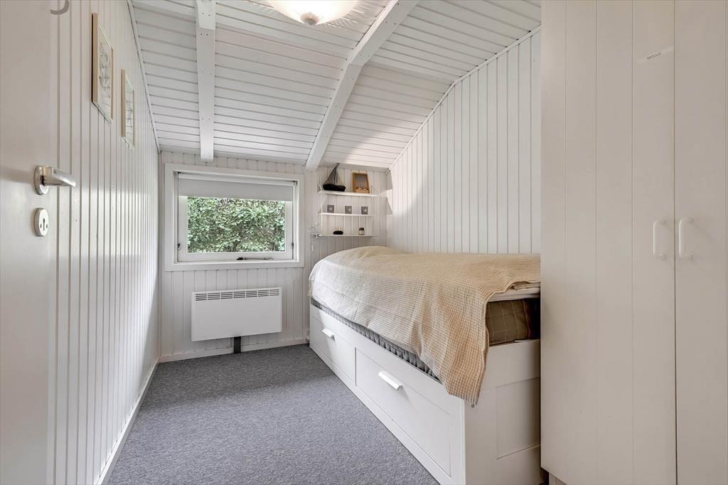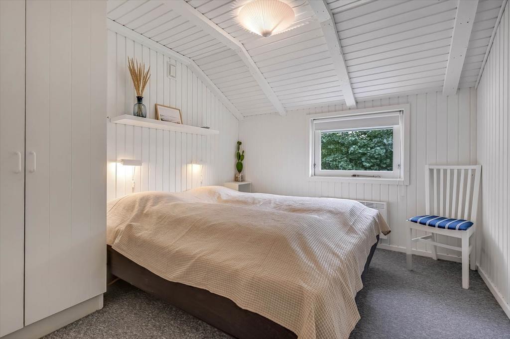 Set udefra er sommerhuset et ganske klassisk træsommerhus, som har stået her i haven siden 1988. Inden døre er en del af husets typiske sommerhustræk fint bevaret – men man kan nu også tydeligt se, at de lyse rum er blevet moderniseret på vellykket vis. Renoveringen foregik i 2018, hvor blandt andet både køkken og bad blev frisket op med stilrent interiør og gode hvidevarer. Det flotte køkken ligger i åben forbindelse med stuen, som er et stemningsfuldt opholdsrum med brændeovn, spisebord og en dejlig sofaafdeling, der indbyder til hygge og afslapning. De hvidmalede trælister på vægge og lofter er ikke kun et charmetræk ved stuen, men bidrager også til den rare stemning på de tre soveværelser, der i alt kan huse seks feriegæster.