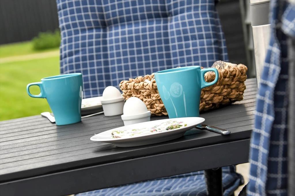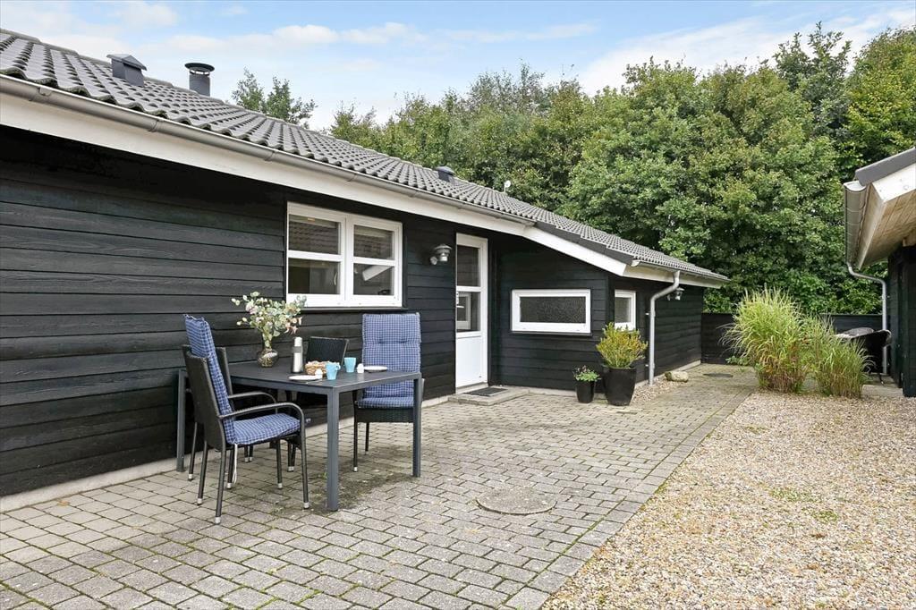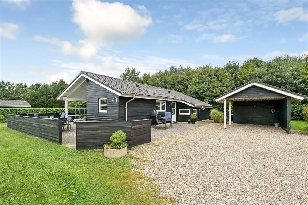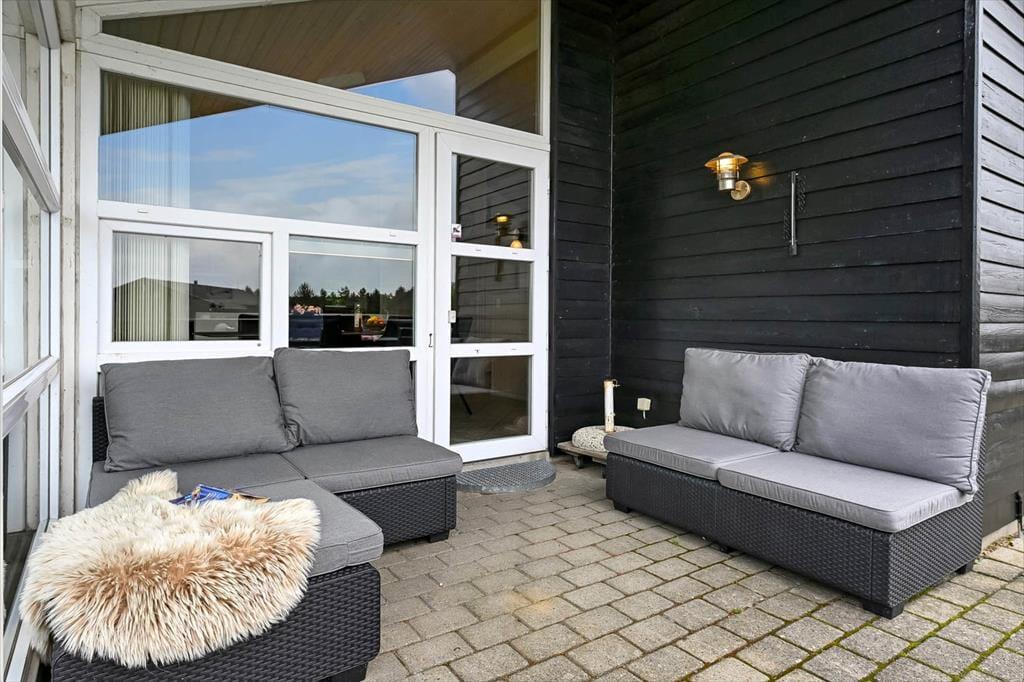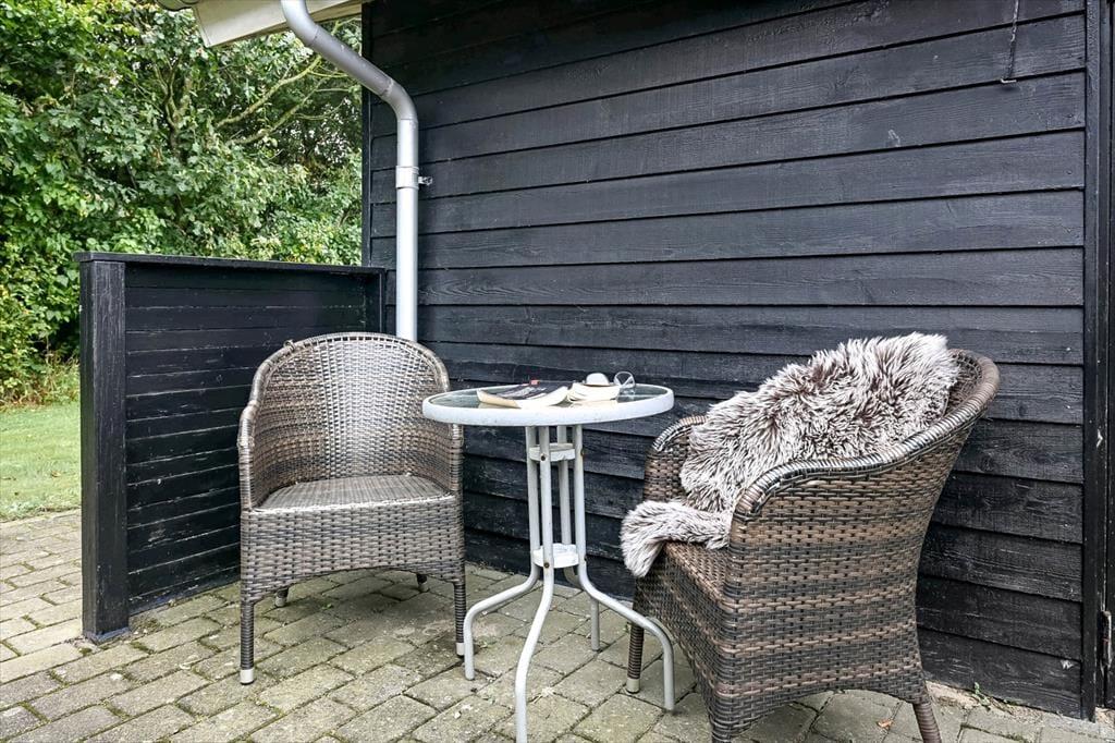 Fra stuen har I direkte adgang til et overdækket terrasseområde, og derfra kan I træde videre ud på det åbne terrassemiljø, der breder sig rundt om huset. Mellem sommerhuset og carporten finder I en lille, læfyldt lomme, hvor I også kan sætte jer i havestolene, medmindre I er mere i humør til at lege og spille bold på grundens store græsplæne.